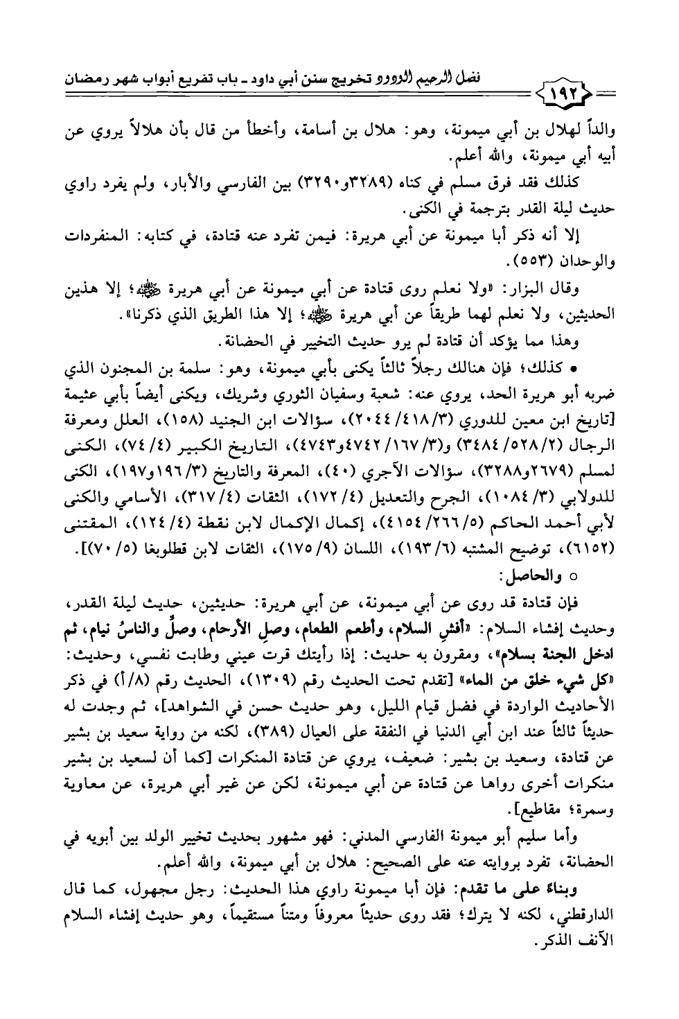 فإن قتادة قد روى عن أبي ميمونة، عن أبي هريرة: حديثين، حديث ليلة القدر، وحديث إفشاء السلام: "أفشِ السلام، وأطعم الطعام، وصلِ الأرحام، وصلِّ والناسُ نيام، ثم ادخل الجنة بسلام"، ومقرون به حديث: إذا رأيتك قرت عيني وطابت نفسي، وحديث: "كل شيء خلق من الماء" [تقدم تحت الحديث رقم (١٣٠٩)، الحديث رقم (٨/ أ) في ذكر الأحاديث الواردة في فضل قيام الليل، وهو حديث حسن في الشواهد]؛ ثم وجدت له حديثًا ثالثًا عند ابن أبي الدنيا في النفقة على العيال (٣٨٩)، لكنه من رواية سعيد بن بشير عن قتادة، وسعيد بن بشير: ضعيف، يروي عن قتادة المنكرات [كما أن لسعيد بن بشير منكرات أخرى رواها عن قتادة عن أبي ميمونة، لكن عن غير أبي هريرة، عن معاوية وسمرة؛ مقاطيع].