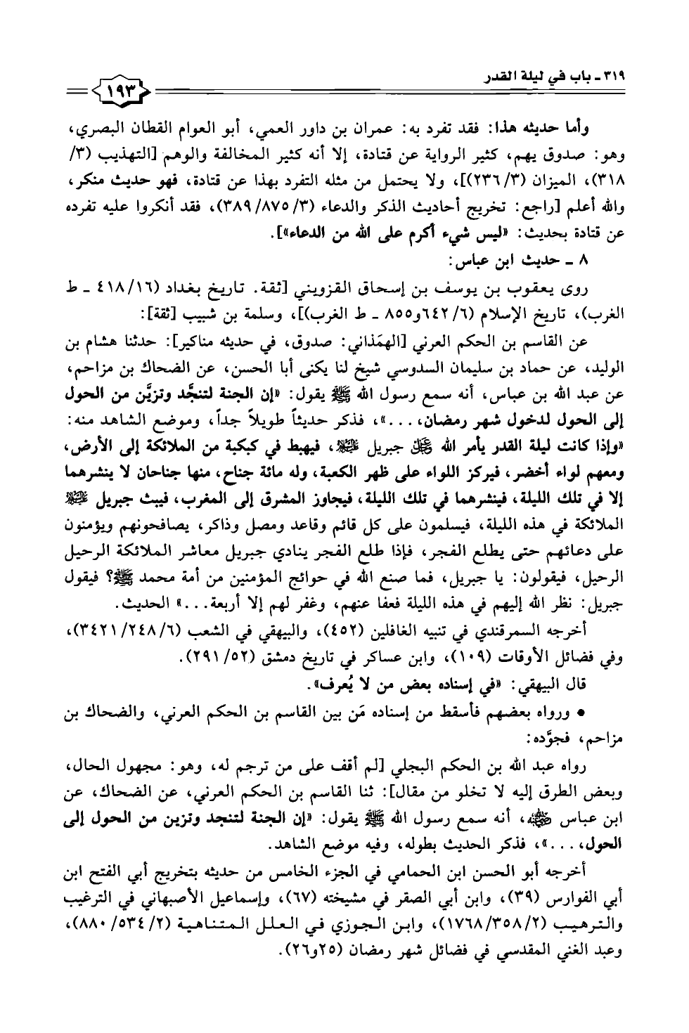 عن القاسم بن الحكم العرني [الهمَذاني: صدوق، في حديثه مناكير]: حدثنا هشام بن الوليد، عن حماد بن سليمان السدوسي شيخ لنا يكنى أبا الحسن، عن الضحاك بن مزاحم، عن عبد الله بن عباس، أنه سمع رسول الله -صلى الله عليه وسلم- يقول: "إن الجنة لتنجَّد وتزيَّن من الحول إلى الحول لدخول شهر رمضان، ... "، فذكر حديثًا طويلًا جدًا، وموضع الشاهد منه: "وإذا كانت ليلة القدر يأمر الله عزَّ وجلَّ جبريل عليه السلام، فيهبط في كبكية من الملائكة إلى الأرض، ومعهم لواء أخضر، فيركز اللواء على ظهر الكعبة، وله مائة جناح، منها جناحان لا ينشرهما إلا في تلك الليلة، فينشرهما في تلك الليلة، فيجاوز المشرق إلى المغرب، فيبث جبريل عليه السلام الملائكة في هذه الليلة، فيسلمون على كل قائم وقاعد ومصل وذاكر، يصافحونهم ويؤمنون على دعائهم حتى يطلع الفجر، فإذا طلع الفجر ينادي جبريل معاشر الملائكة الرحيل الرحيل، فيقولون: يا جبريل، فما صنع الله في حوائج المؤمنين من أمة محمد -صلى الله عليه وسلم-؛ فيقول جبريل: نظر الله إليهم في هذه الليلة فعفا عنهم، وغفر لهم إلا أربعة ... " الحديث.