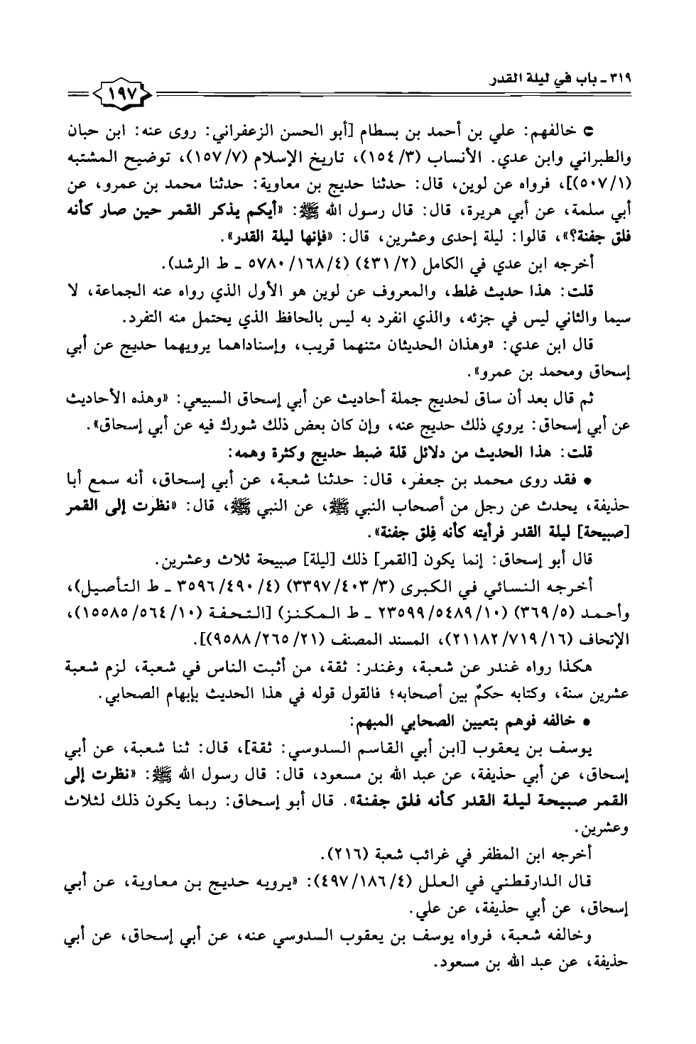 يوسف بن يعقوب [ابن أبي القاسم السدوسي: ثقة]، قال: ثنا شعبة، عن أبي إسحاق، عن أبي حذيفة، عن عبد اللّه بن مسعود، قال: قال رسول اللّه - صلى الله عليه وسلم -: "نظرت إلى القمر صبيحة ليلة القدر كأنه فلق جفنة". قال أبو إسحاق: ربما يكون ذلك لثلاث وعشرين.