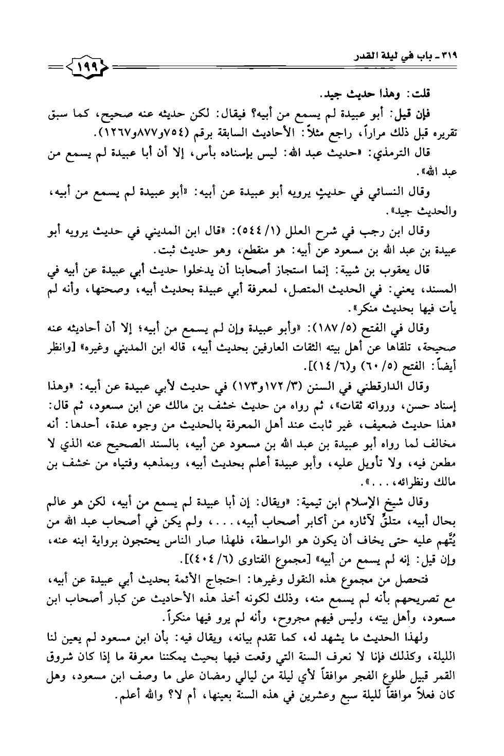 وقال الدارقطني في السنن (٣/ ١٧٢ و ١٧٣) في حديث لأبي عبيدة عن أبيه: "وهذا إسناد حسن، ورواته ثقات"، ثم رواه من حديث خشف بن مالك عن ابن مسعود، ثم قال: "هذا حديث ضعيف، غير ثابت عند أهل المعرفة بالحديث من وجوه عدة، أحدها: أنه مخالف لما رواه أبو عبيدة بن عبد اللّه بن مسعود عن أبيه، بالسند الصحيح عنه الذي لا مطعن فيه، ولا تأويل عليه، وأبو عبيدة أعلم بحديث أبيه، وبمذهبه وفتياه من خشف بن مالك ونظرائه، ... ".