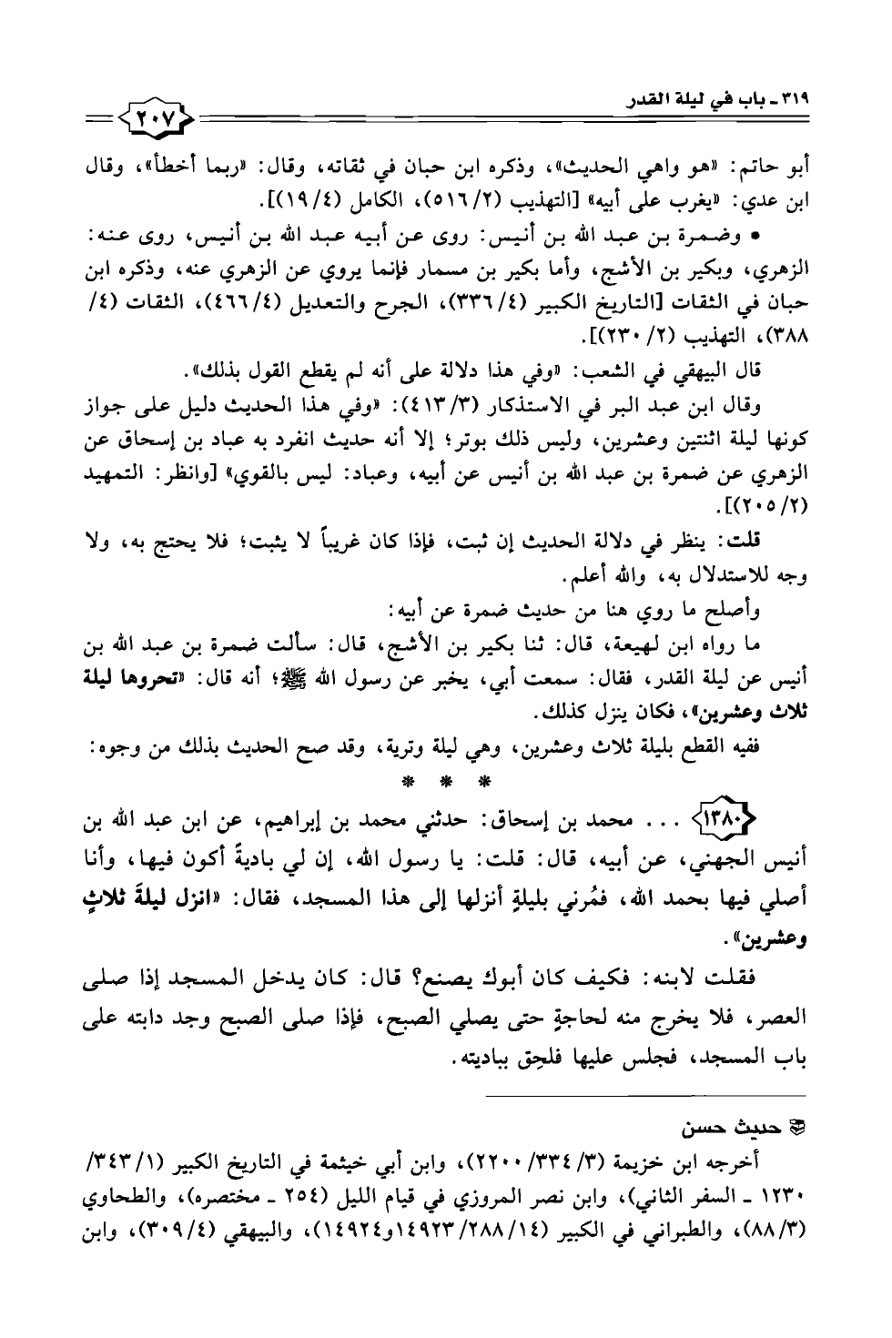 وقال ابن عبد البر في الاستذكار (٣/ ٤١٣): "وفي هذا الحديث دليل على جواز كونها ليلة اثنتين وعشرين، وليس ذلك بوتر؛ إلا أنه حديث انفرد به عباد بن إسحاق عن الزهري عن ضمرة بن عبد الله بن أنيس عن أبيه، وعباد: ليس بالقوي" [وانظر: التمهيد (٢/ ٢٠٥)].