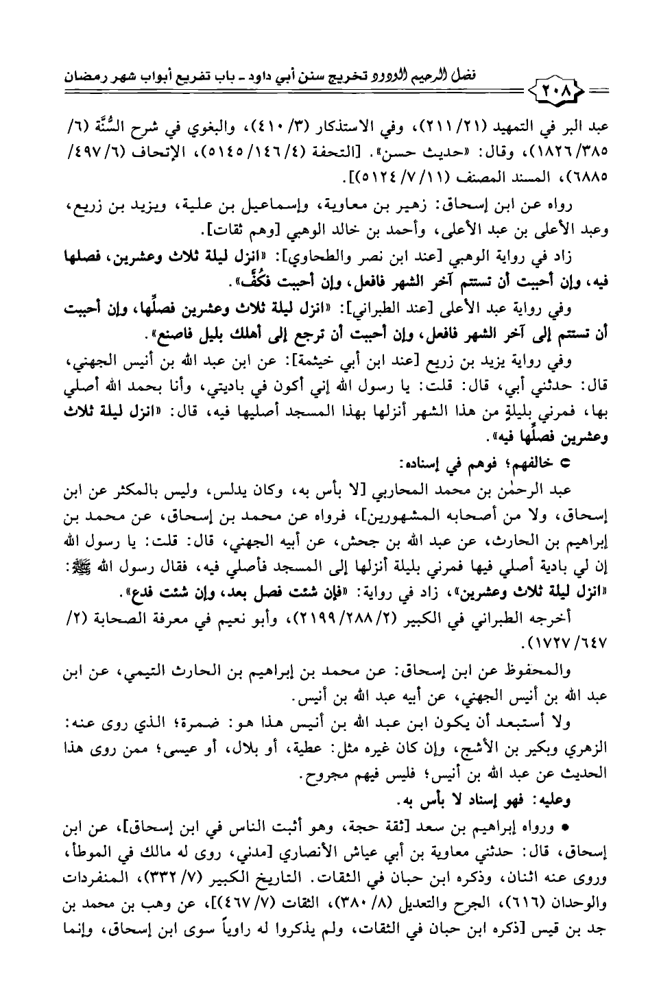 عبد الرحمن بن محمد المحاربي [لا بأس به، وكان يدلس، وليس بالمكثر عن ابن إسحاق، ولا من أصحابه المشهورين]، فرواه عن محمد بن إسحاق، عن محمد بن إبراهيم بن الحارث، عن عبد اللّه بن جحش، عن أبيه الجهني، قال: قلت: يا رسول اللّه إن لي بادية أصلي فيها فمرني بليلة أنزلها إلى المسجد فأصلي فيه، فقال رسول الله - صلى الله عليه وسلم -: "انزل ليلة ثلاث وعشرين"، زاد في رواية: "فإن شئت فصل بعد، وإن شئت فدع".