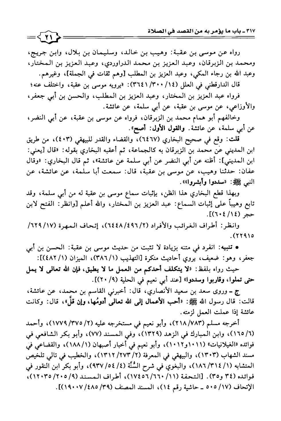 قلت: وقع في صحيح البخاري (٦٤٦٧)، والقضاء والقدر للبيهقي (٤٠٣)، من طريق ابن المديني عن محمد بن الزبرقان به كالجماعة، ثم أعقبه البخاري بقوله: "قال [يعني: ابن المديني]: أظنه عن أبي النضر عن أبي سلمة عن عائشة"، ثم قال البخاري: "وقال عفان: حدثنا وهيب، عن موسى بن عقبة، قال: سمعت أبا سلمة، عن عائشة، عن النبي - صلى الله عليه وسلم -: "سددوا وأبشروا"".