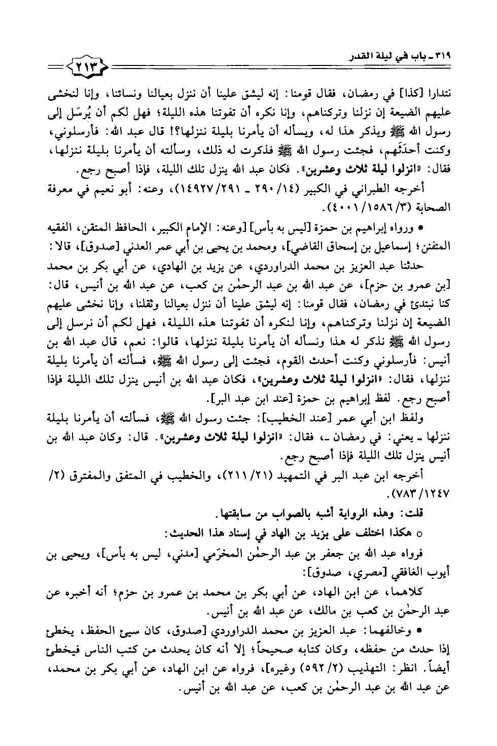 حدثنا عبد العزيز بن محمد الدراوردي، عن يزيد بن الهادي، عن أبي بكر بن محمد [بن عمرو بن حزم]، عن عبد اللّه بن عبد الرحمن بن كعب، عن عبد الله بن أنيس، قال: كنا نبتدئ في رمضان، فقال قومنا: إنه ليشق علينا أن ننزل بعيالنا وثقلنا، وإنا نخشى عليهم الضيعة إن نزلنا وتركناهم، وإنا لنكره أن تفوتنا هذه الليلة، فهل لكم أن نرسل إلى رسول الله - صلى الله عليه وسلم - نذكر له هذا ونسأله أن يأمرنا بليلة ننزلها، قالوا: نعم، قال عبد الله بن أنيس: فأرسلوني وكنت أحدث القوم، فجئت إلى رسول الله - صلى الله عليه وسلم -، فسألته أن يأمرنا بليلة ننزلها، فقال: "انزلوا ليلة ثلاث وعشرين"، فكان عبد الله بن أنيس ينزل تلك الليلة فإذا أصبح رجع. لفظ إبراهيم بن حمزة [عند ابن عبد البر].