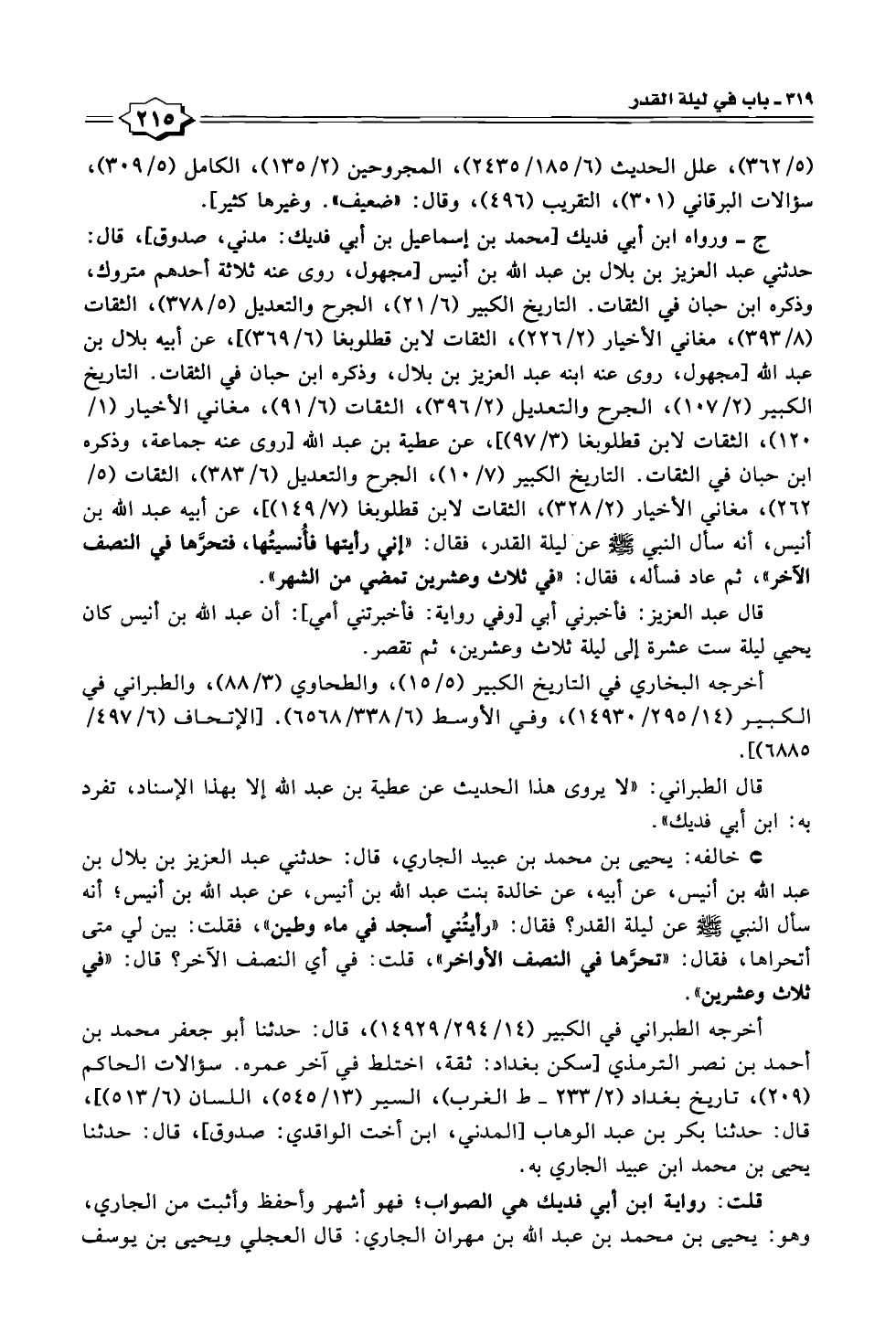 ج- ورواه ابن أبي فديك [محمد بن إسماعيل بن أبي فديك: مدني، صدوق]، قال: حدثني عبد العزيز بن بلال بن عبد الله بن أنيس [مجهول، روى عنه ثلاثة أحدهم متروك، وذكره ابن حبان في الثقات. التاريخ الكبير (٦/ ٢١)، الجرح والتعديل (٥/ ٣٧٨)، الثقات (٨/ ٣٩٣)، مغاني الأخيار (٢/ ٢٢٦)، الثقات لابن قطلوبغا (٦/ ٣٦٩)]، عن أبيه بلال بن عبد اللّه [مجهول، روى عنه ابنه عبد العزيز بن بلال، وذكره ابن حبان في الثقات. التاريخ الكبير (٢/ ١٠٧)، الجرح والتعديل (٢/ ٣٩٦)، الثقات (٦/ ٩١)، مغاني الأخيار (١/ ١٢٠)، الثقات لابن قطلوبغا (٣/ ٩٧)]، عن عطية بن عبد الله [روى عنه جماعة، وذكره ابن حبان في الثقات. التاريخ الكبير (٧/ ١٠)، الجرح والتعديل (٦/ ٣٨٣)، الثقات (٥/ ٢٦٢)، مغاني الأخيار (٢/ ٣٢٨)، الثقات لابن قطلوبغا (١٤٩/ ٧)]، عن أبيه عبد الله بن أنيس، أنه سأل النبي - صلى الله عليه وسلم - عن- ليلة القدر، فقال: "إني رأيتها فأُنسيتُها، فتحرَّها في النصف الآخر"، ثم عاد فسأله، فقال: "في ثلاث وعشرين تمضي من الشهر".