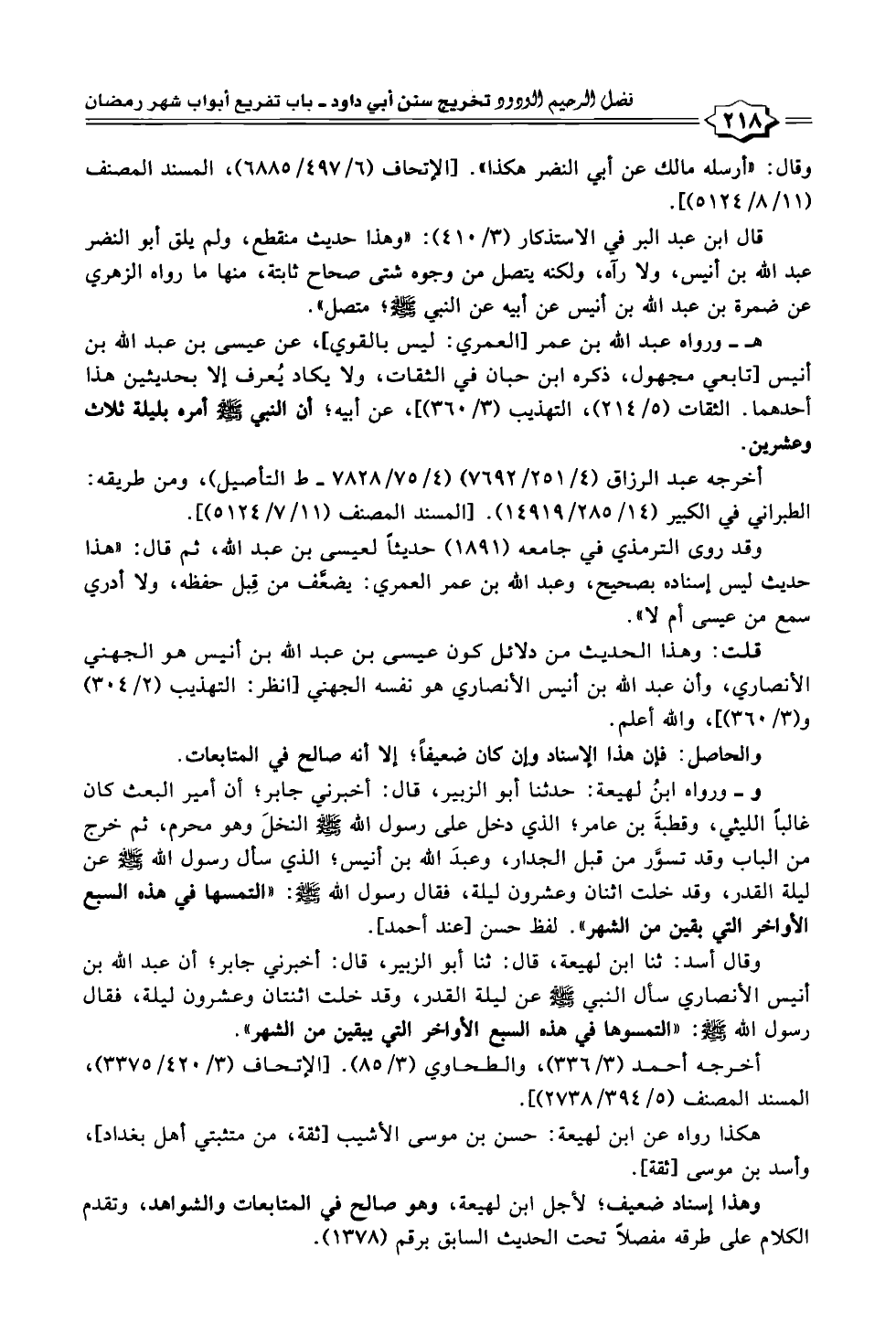 و- ورواه ابنُ لهيعة: حدثنا أبو الزبير، قال: أخبرني جابر؛ أن أمير البعث كان غالبًا الليثي، وقطبةَ بن عامر؛ الذي دخل على رسول الله - صلى الله عليه وسلم - النخلَ وهو محرم، ثم خرج من الباب وقد تسوَّر من قبل الجدار، وعبدَ الله بن أنيس الذي سأل رسول الله - صلى الله عليه وسلم - عن ليلة القدر، وقد خلت اثنان وعشرون ليلة، فقال رسول اللّه - صلى الله عليه وسلم -: "التمسوها في هذه السبع الأواخر التي بقين من الشهر". لفظ حسن [عند أحمد].