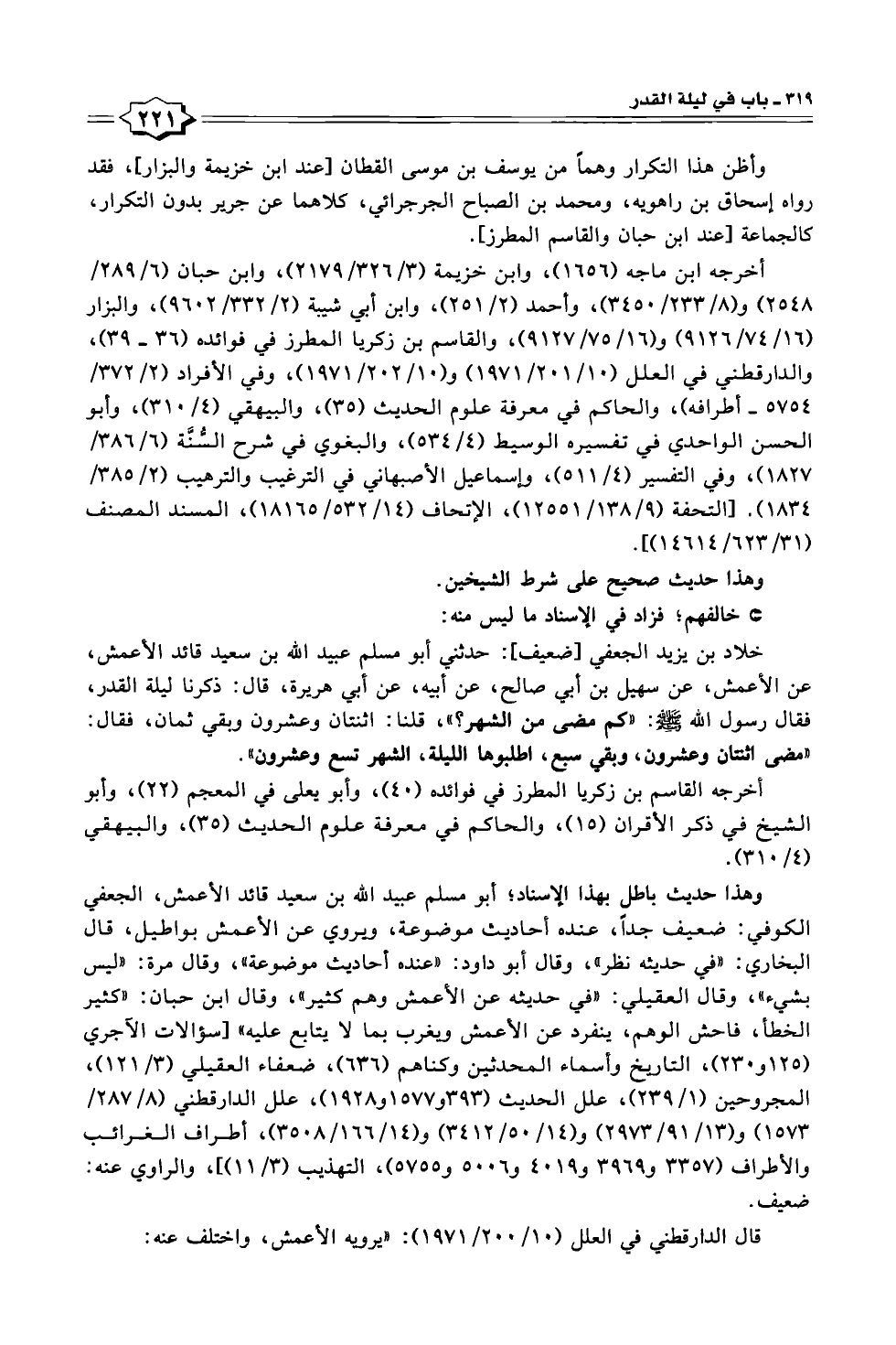 خلاد بن يزيد الجعفي [ضعيف]: حدثني أبو مسلم عبيد اللّه بن سعيد قائد الأعمش، عن الأعمش، عن سهيل بن أبي صالح، عن أبيه، عن أبي هريرة، قال: ذكرنا ليلة القدر، فقال رسول اللّه - صلى الله عليه وسلم -: "كم مضى من الشهر؟ "، قلنا: اثنتان وعشرون وبقي ثمان، فقال: "مضى اثنتان وعشرون، وبقي سبع، اطلبوها الليلة، الشهر تسع وعشرون".