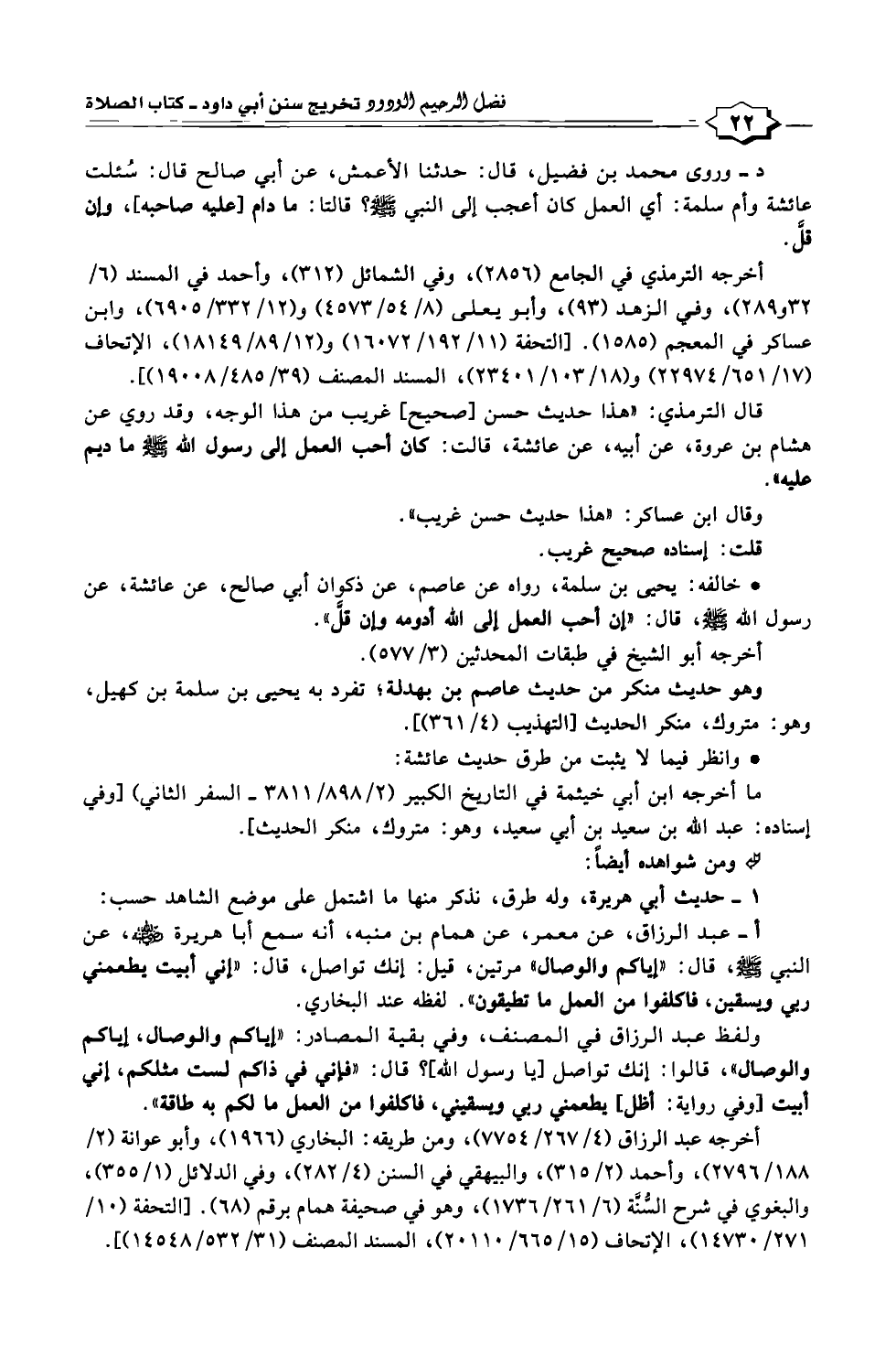 د- وروى محمد بن فضيل، قال: حدثنا الأعمش، عن أبي صالح قال: سُئلت عائشة وأم سلمة: أي العمل كان أعجب إلى النبي - صلى الله عليه وسلم -؟ قالتا: ما دام [عليه صاحبه]، وإن قلَّ.