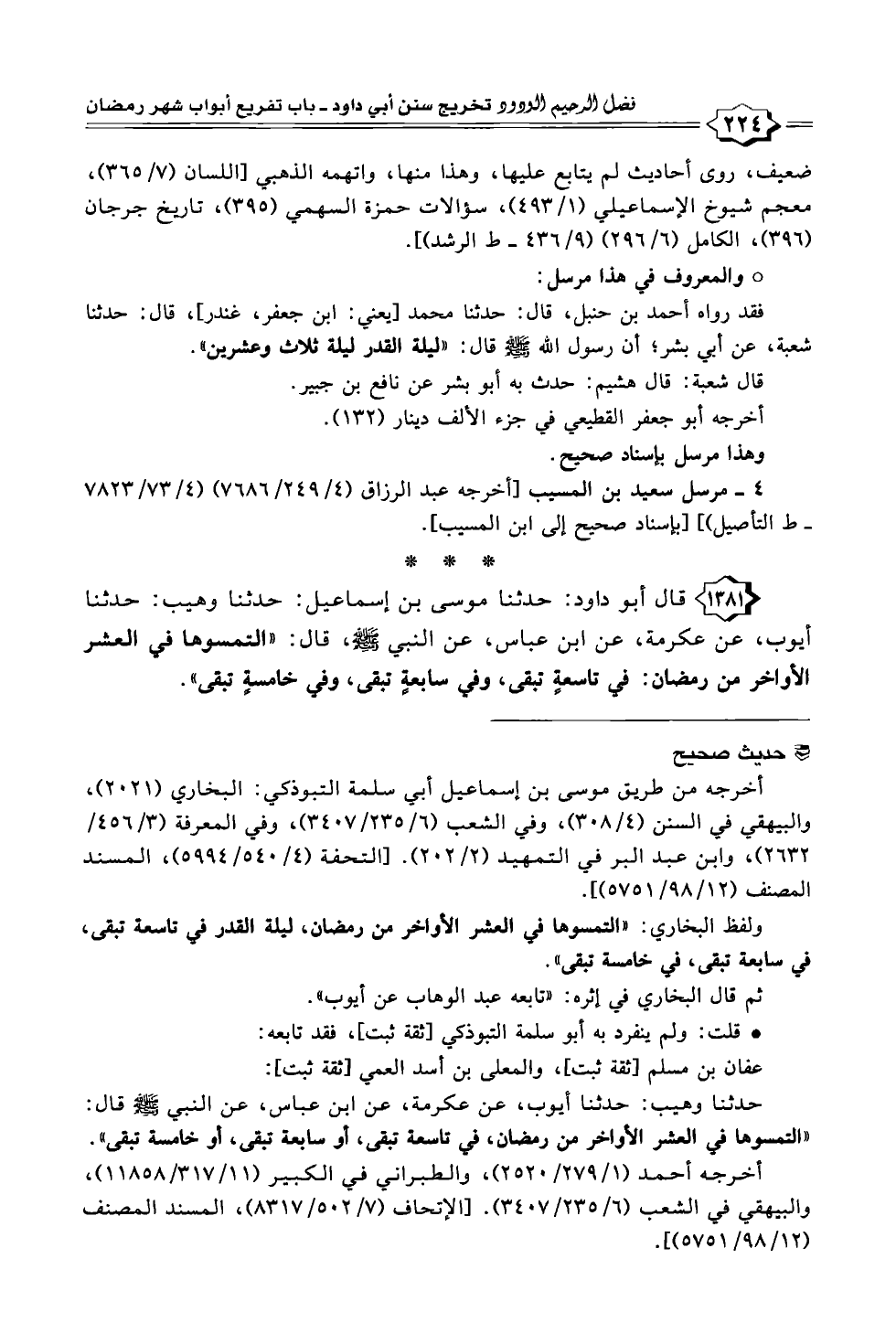 ١٣٨١ - قال أبو داود: حدثنا موسى بن إسماعيل: حدثنا وهيب: حدثنا أيوب، عن عكرمة، عن ابن عباس، عن النبي - صلى الله عليه وسلم -، قال: "التمسوها في العشر الأواخر من رمضان: في تاسعةٍ تبقى، وفي سابعةٍ تبقى، وفي خامسةٍ تبقى".