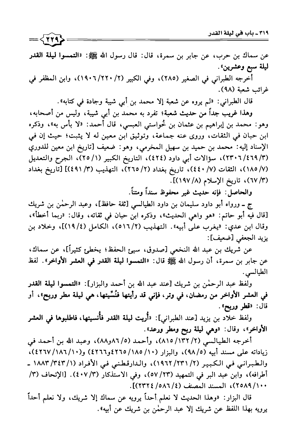 عن شريك بن عبد الله النخعي [صدوق، سيئ الحفظ؛ يخطئ كثيرًا]، عن سماك، عن جابر بن سمرة، أن رسول الله - صلى الله عليه وسلم - قال: "التمسوا ليلة القدر في العشر الأواخر". لفظ الطيالسي.