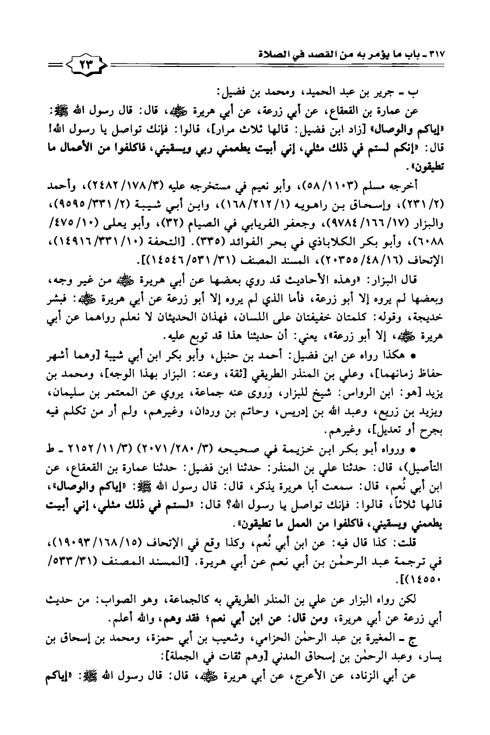 • ورواه أبو بكر ابن خزيمة في صحيحه (٣/ ٢٨٠/ ٢٠٧١) (٣/ ١١/ ٢١٥٢ - ط التأصيل)، قال: حدثنا علي بن المنذر: حدثنا ابن فضيل: حدثنا عمارة بن القعقاع، عن ابن أبي نُعم، قال: سمعت أبا هريرة يذكر، قال: قال رسول الله - صلى الله عليه وسلم -: "إياكم والوصال"، قالها ثلاثاً، قالوا: فإنك تواصل يا رسول الله؟ قال: "لستم في ذلك مثلي، اني أبيت يطعمني ويسقيني، فاكلفوا من العمل ما تطيقون".