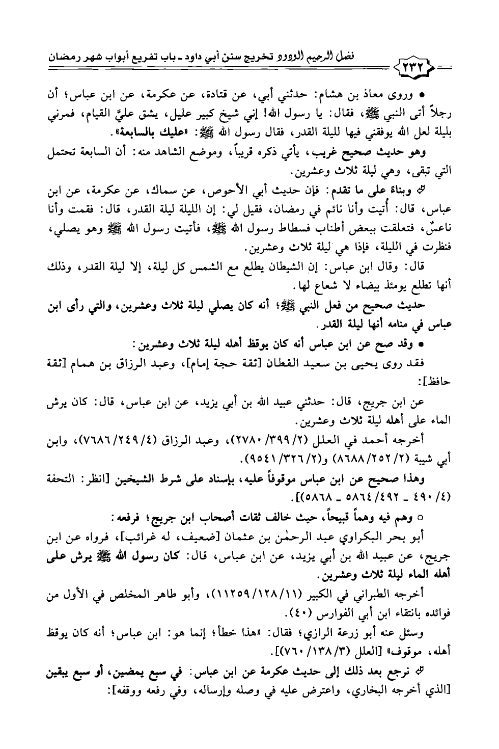 * وروى معاذ بن هشام: حدثني أبي، عن قتادة، عن عكرمة، عن ابن عباس؛ أن رجلًا أتى النبي - صلى الله عليه وسلم -، فقال: يا رسول اللّه! إني شيخ كبير عليل، يشق عليَّ القيام، فمرني بليلة لعل اللّه يوفقني فيها لليلة القدر، فقال رسول اللّه - صلى الله عليه وسلم -: "عليك بالسابعة".