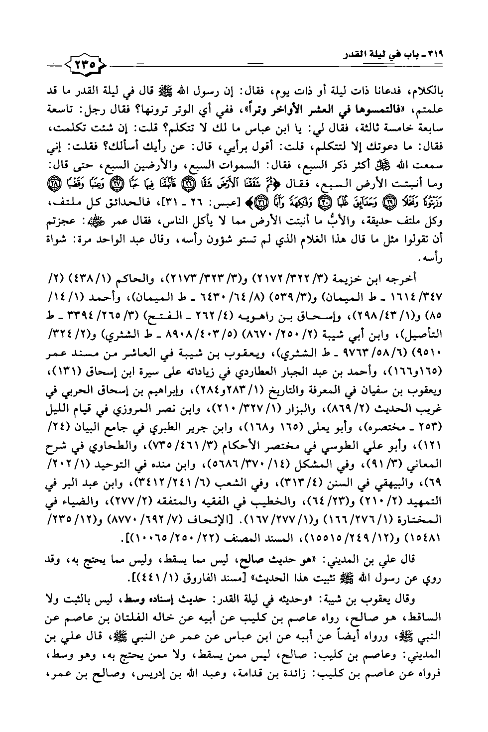 بالكلام، فدعانا ذات ليلة أو ذات يوم، فقال: إن رسول اللّه - صلى الله عليه وسلم - قال في ليلة القدر ما قد علمتم، "فالتمسوها في العشر الأواخر وترًا"، ففي أي الوتر ترونها؟ فقال رجل: تاسعة سابعة خامسة ثالثة، فقال لي: يا ابن عباس ما لك لا تتكلم؟ قلت: إن شئت تكلمت، فقال: ما دعوتك إلا لتتكلم، قلت: أقول برأيي، قال: عن رأيك أسألك؟ فقلت: إني سمعت الله عز وجل أكثر ذكر السبع، فقال: السموات السبع، والأرضين السبع، حتى قال: وما أنبتت الأرض السبع، فقال {ثُمَّ شَقَقْنَا الْأَرْضَ شَقًّا (٢٦) فَأَنْبَتْنَا فِيهَا حَبًّا (٢٧) وَعِنَبًا وَقَضْبًا (٢٨) وَزَيْتُونًا وَنَخْلًا (٢٩) وَحَدَائِقَ غُلْبًا (٣٠) وَفَاكِهَةً وَأَبًّا (٣١)} [عبس: ٢٦ - ٣١]، فالحدائق كل ملتف، وكل ملتف حديقة، والأبُّ ما أنبتت الأرض مما لا يأكل الناس، فقال عمر - رضي الله عنه -: عجزتم أن تقولوا مثل ما قال هذا الغلام الذي لم تستو شؤون رأسه، وقال عبد الواحد مرة: شواة رأسه.