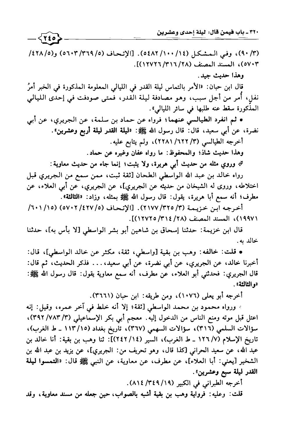 • ورواه محمود بن محمد الواسطي [ثقة؛ إلا أنه خلط في آخر عمره، وقيل: إنه اعتل قبل موته ومنع الناس من الدخول إليه. معجم أبي بكر الإسماعيلي (٣٩٢/ ٣/ ٧٨٣)، سؤالات السلمي (٣١٦)، سؤالات السهمي (٣٦٧)، تاريخ بغداد (١٥/ ١١٣ - ط الغرب)، تاريخ الإسلام (٧/ ١٢٦ - ط الغرب)، السير (١٤/ ٢٤٢)،: ثنا وهب بن بقية: أنا خالد بن عبد الله، عن سعيد الحراني [كذا قال، وهو تحريف من: الجريري]، عن يزيد بن عبد الله بن الشخير [يعني: أبا العلاء]، عن مطرف، عن معاوية، عن النبي - صلى الله عليه وسلم - قال: "التمسوا ليلة القدر ليلة سبع وعشرين".