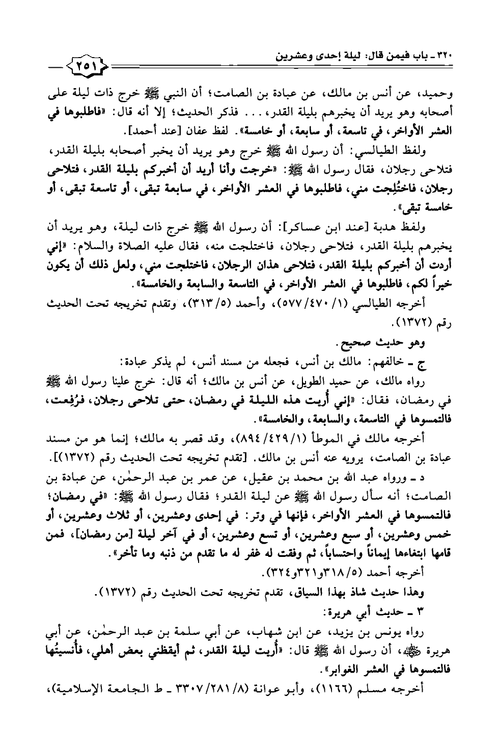 د- ورواه عبد الله بن محمد بن عقيل، عن عمر بن عبد الرحمن، عن عبادة بن الصامت؛ أنه سأل رسول الله - صلى الله عليه وسلم - عن ليلة القدر؛ فقال رسول الله - صلى الله عليه وسلم -: "في رمضان؛ فالتمسوها في العشر الأواخر، فإنها في وتر: في إحدى وعشرين، أو ثلاث وعشرين، أو خمس وعشرين، أو سبع وعشرين، أو تسع وعشرين، أو في آخر ليلة [من رمضان]، فمن قامها ابتغاءها إيماناً واحتساباً، ثم وفقت له غفر له ما تقدم من ذنبه وما تأخر".