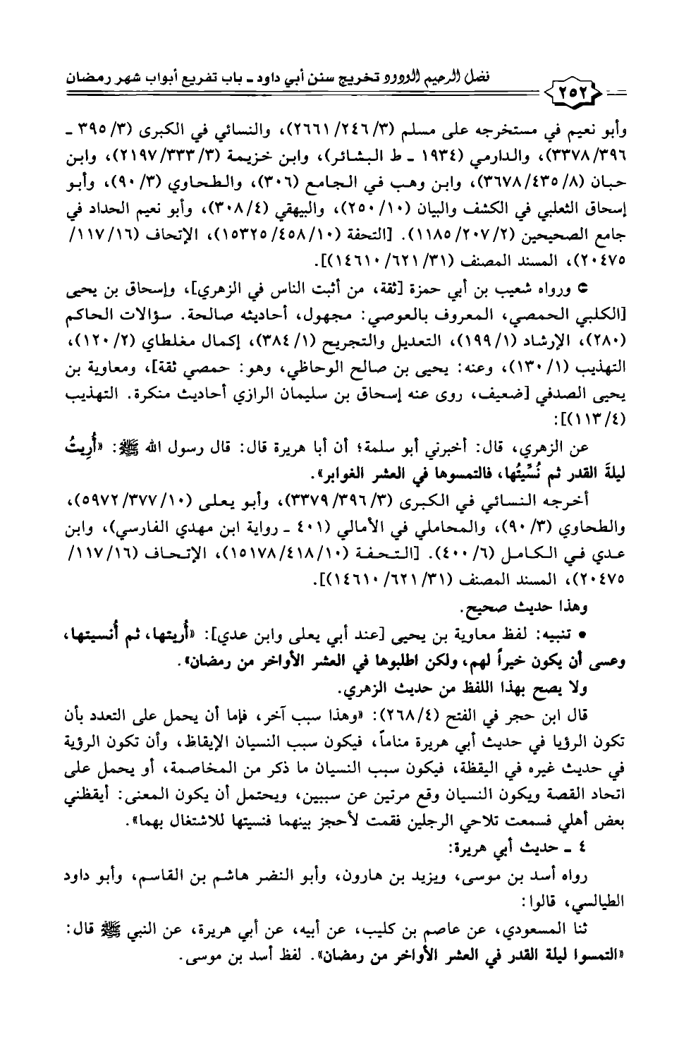 • تنبيه: لفظ معاوية بن يحيى [عند أبي يعلى وابن عدي]: "أُريتها، ثم أُنسيتها، وعسى أن يكون خيراً لهم، ولكن اطلبوها في العشر الأواخر من رمضان".