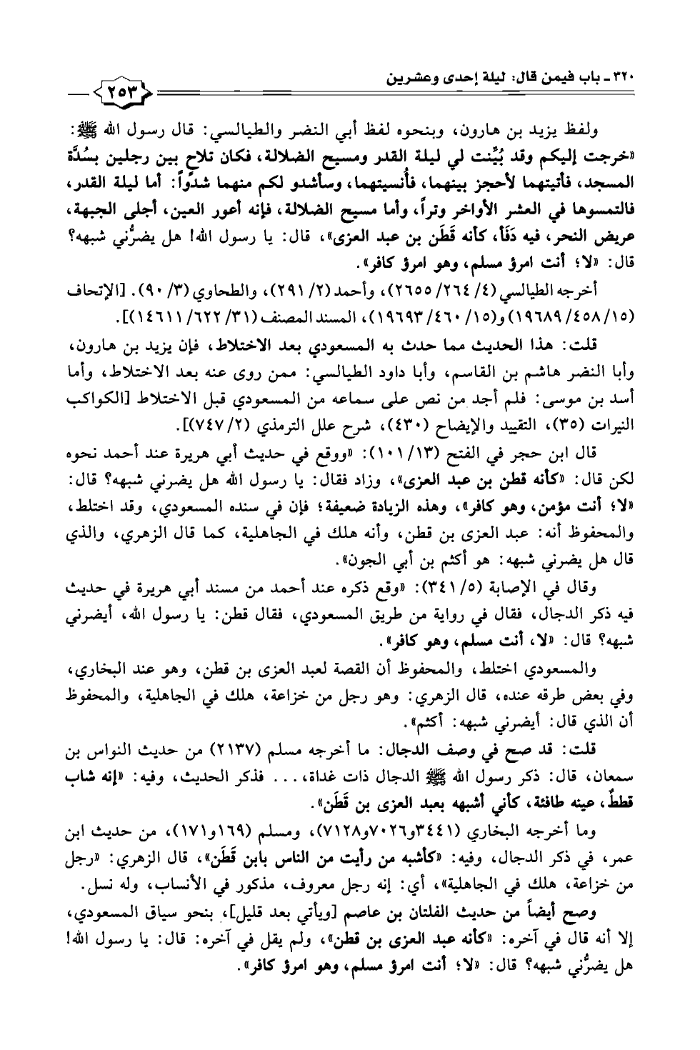 والمسعودي اختلط، والمحفوظ أن القصة لعبد العزى بن قطن، وهو عند البخاري، وفي بعض طرقه عنده، قال الزهري: وهو رجل من خزاعة، هلك في الجاهلية، والمحفوظ أن الذي قال: أيضرني شبهه: أكثم".