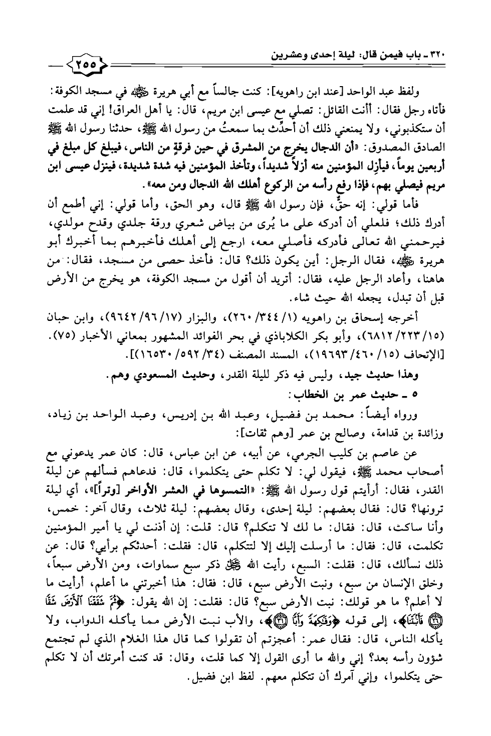 عن عاصم بن كليب الجرمي، عن أبيه، عن ابن عباس، قال: كان عمر يدعوني مع أصحاب محمد - صلى الله عليه وسلم -، فيقول في: لا تكلم حتى يتكلموا، قال: فدعاهم فسألهم عن ليلة القدر، فقال: أرأيتم قول رسول الله - صلى الله عليه وسلم -: "التمسوهما في العشر الأواخر [وتراً] "، أي ليلة ترونها؟ قال: فقال بعضهم: ليلة إحدى، وقال بعضهم: ليلة ثلاث، وقال آخر: خمس، وأنا ساكت، قال: فقال: ما لك لا تتكلم؟ قال: قلت: إن أذنت في يا أمير المؤمنين تكلمت، قال: فقال: ما أرسلت إليك إلا لتتكلم، قال: فقلت: أحدثكم برأي؟ قال: عن ذلك نسألك، قال: فقلت: السبع، رأيت الله - عز وجل - ذكر سبع سماوات، ومن الأرض سبعاً، وخلق الإنسان من سبع، ونبت الأرض سبع، قال: فقال: هذا أخبرتني ما أعلم، أرأيت ما لا أعلم؟ ما هو قولك: نبت الأرض سبع؟ قال: فقلت: إن الله يقول: {ثُمَّ شَقَقْنَا الْأَرْضَ شَقًّا (٢٦) فَأَنْبَتْنَا}، إلى قوله {وَفَاكِهَةً وَأَبًّا (٣١)}، والأب نبت الأرض مما يأكله الدواب، ولا يأكله الناس، قال: فقال عمر: أعجزتم أن تقولوا كما قال هذا الغلام الذي لم تجتمع شؤون رأسه بعد؟ إني والله ما أرى القول إلا كما قلت، وقال: قد كنت أمرتك أن لا تكلم حتى يتكلموا، وإني آمرك أن تتكلم معهم. لفظ ابن فضيل.