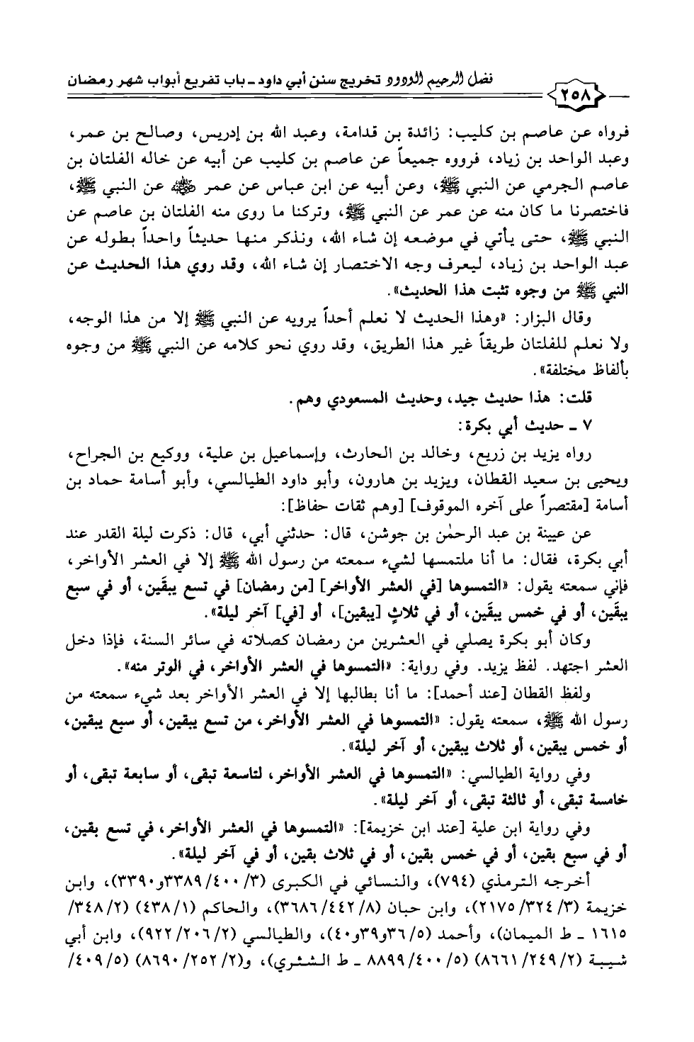 وفي رواية الطيالسي: "التمسوها في العشر الأواخر، لتاسعة تبقى، أو سابعة تبقى، أو خامسة تبقى، أو ثالثة تبقى، أو آخر ليلة".