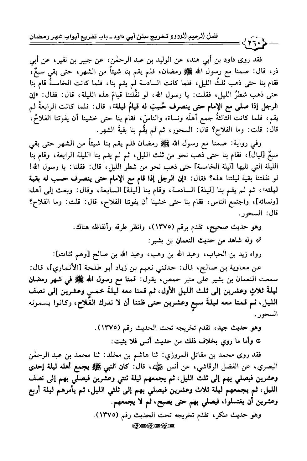 فقد روى داود بن أبي هند، عن الوليد بن عبد الرحمن، عن جبير بن نفير، عن أبي ذر، قال: صمنا مع رسول الله - صلى الله عليه وسلم - رمضان، فلم يقم بنا شيئاً من الشهر، حتى بقي سبعٌ، فقام بنا حتى ذهب ثلثُ الليل، فلما كانت السادسة لم يقم بنا، فلما كانت الخامسةُ قام بنا حتى ذهب شطرُ الليل، فقلت: يا رسول الله، لو نفَّلتنا قيامَ هذه الليلة، قال: فقال: "إن الرجل إذا صلى مع الإمام حتى ينصرف حُسِبَ له قيامُ ليلة"، قال: فلما كانت الرابعةُ لم يقم، فلما كانت الثالثةُ جمع أهلَه ونساءَه والناسَ، فقام بنا حتى خشينا أن يفوتنا الفلاحُ، قال: قلت: وما الفلاح؟ قال: السحور، ثم لم يقُم بنا بقيةَ الشهر.
