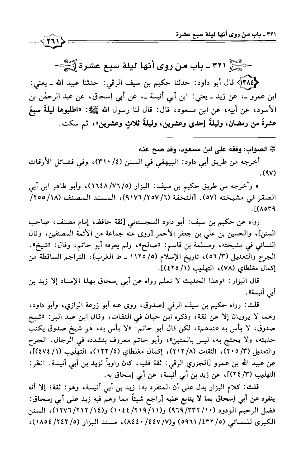 ١٣٨٤ - قال أبو داود: حدثنا حكيم بن سيف الرقي: حدثنا عبيد الله -يعني: ابن عمرو-، عن زيد -يعني: ابن أبي أنيسة-، عن أبي إسحاق، عن عبد الرحمن بن الأسود، عن أبيه، عن ابن مسعود، قال: قال لنا رسول الله - صلى الله عليه وسلم -: "اطلبوهما ليلةَ سبعَ عشرةَ من رمضان، وليلةَ إحدى وعشرين، وليلةَ ثلاثٍ وعشرين"، ثم سكت.