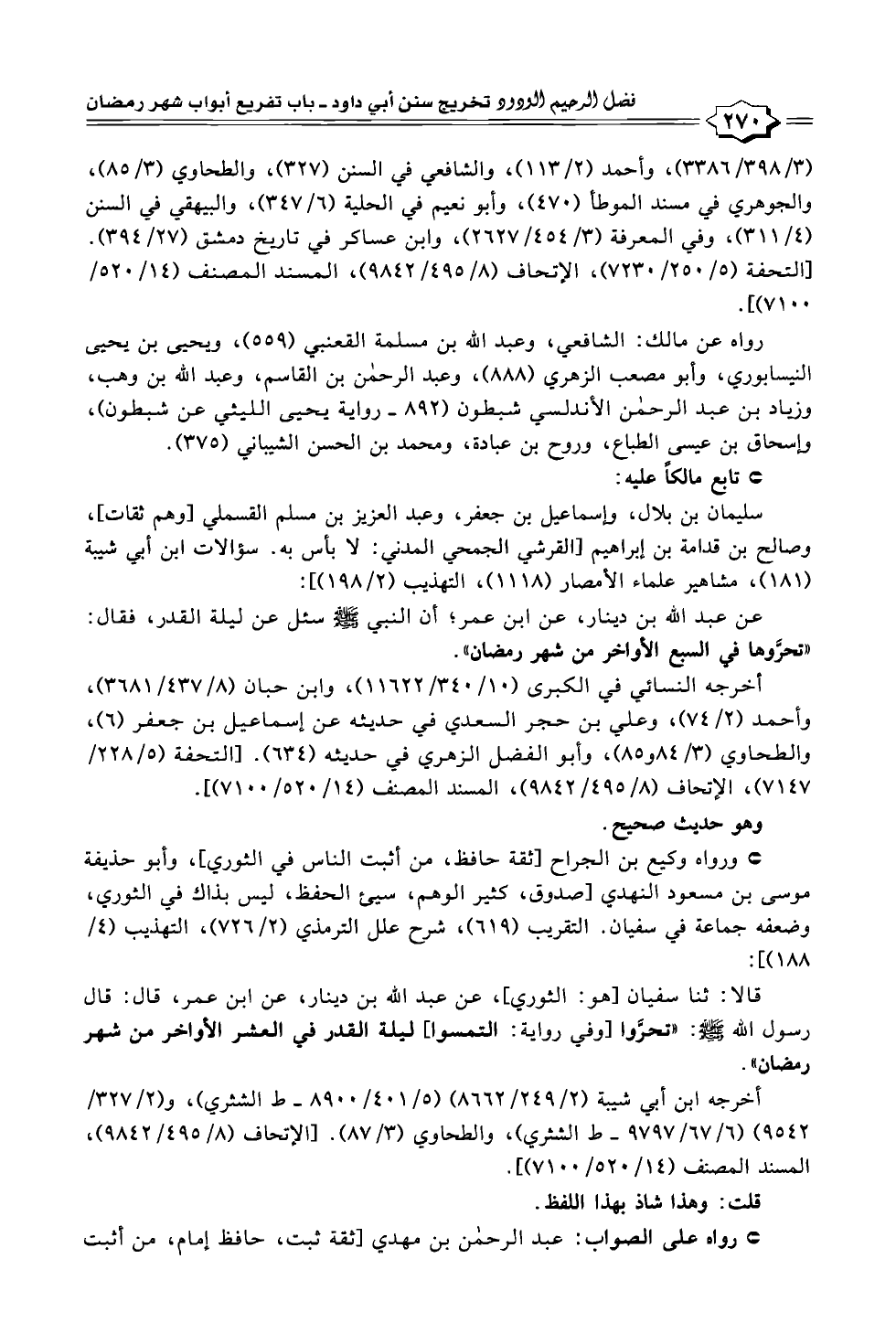 قالا: ثنا سفيان [هو: الثوري]، عن عبد الله بن دينار، عن ابن عمر، قال: قال رسول الله - صلى الله عليه وسلم -: "تحرَّوا [وفي رواية: التمسوا] ليلة القدر في العشر الأواخر من شهر رمضان".