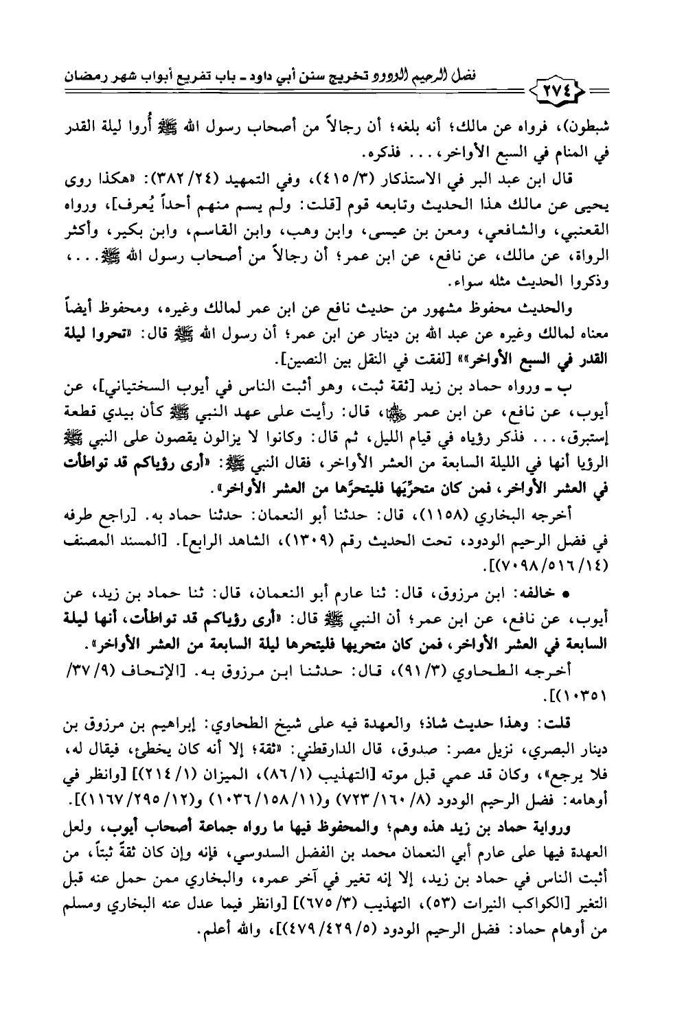 ب- ورواه حماد بن زيد [ثقة ثبت، وهو أثبت الناس في أيوب السختياني]، عن أيوب، عن نافع، عن ابن عمر - رضي الله عنهما -، قال: رأيت على عهد النبي - صلى الله عليه وسلم - كأن بيدي قطعة إستبرق، ... فذكر رؤياه في قيام الليل، ثم قال: وكانوا لا يزالون يقصون على النبي - صلى الله عليه وسلم - الرؤيا أنها في الليلة السابعة من العشر الأواخر، فقال النبي - صلى الله عليه وسلم -: "أرى رؤياكم قد تواطأت في العشر الأواخر، فمن كان متحرِّيَها فليتحرِّها من العشر الأواخر".