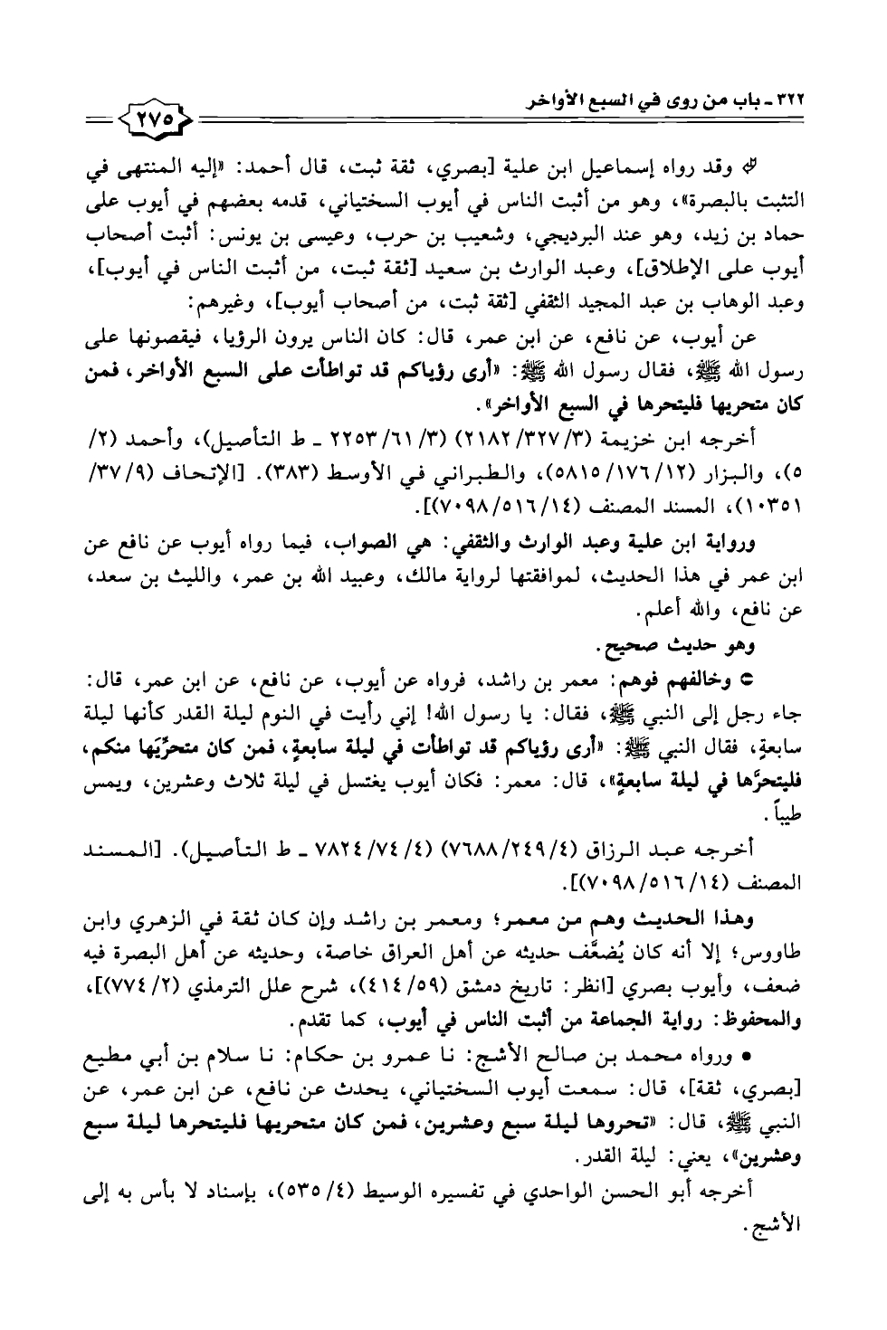 • ورواه محمد بن صالح الأشج: نا عمرو بن حكام: نا سلام بن أبي مطيع [بصري، ثقة]، قال: سمعت أيوب السختياني، يحدث عن نافع، عن ابن عمر، عن النبي - صلى الله عليه وسلم -، قال: "تحروها ليلة سبع وعشرين، فمن كان متحريها فليتحرها ليلة سبع وعشرين"، يعني: ليلة القدر.