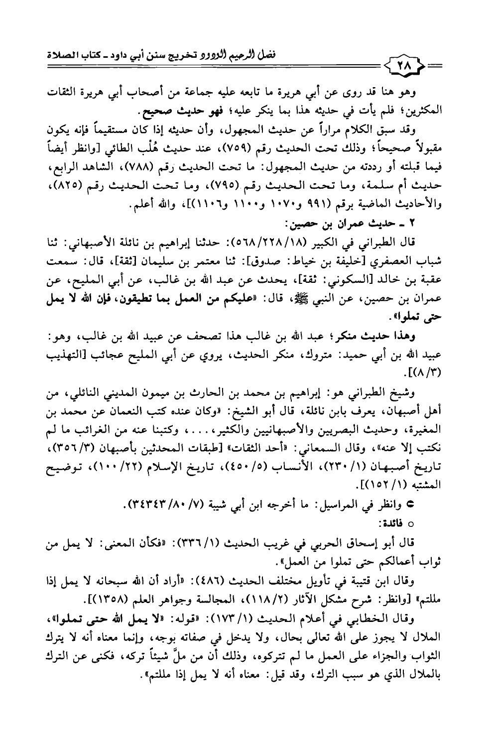 قال الطبراني في الكبير (١٨/ ٢٢٨/ ٥٦٨]: حدثنا إبراهيم بن نائلة الأصبهاني: ثنا شباب العصفري [خليفة بن خياط: صدوق]: ثنا معتمر بن سليمان [ثقة]، قال: سمعت عقبة بن خالد [السكوني: ثقة]، يحدث عن عبد الله بن غالب، عن أبي المليح، عن عمران بن حصين، عن النبي - صلى الله عليه وسلم -، قال: "عليكم من العمل بما تطيقون، فإن الله لا يمل حتى تملوا".