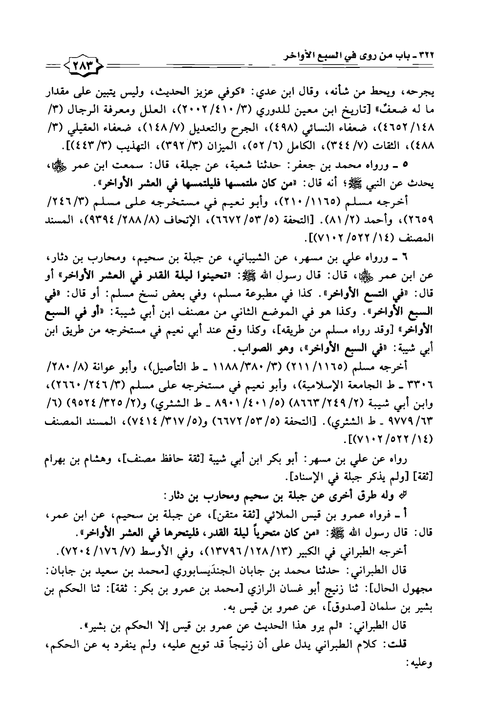 ٦ - ورواه علي بن مسهر، عن الشيباني، عن جبلة بن سحيم، ومحارب بن دثار، عن ابن عمر - رضي الله عنهما -، قال: قال رسول الله - صلى الله عليه وسلم -: "تحينوا ليلة القدر في العشر الأواخر" أو قال: "في التسع الأواخر". كذا في مطبوعة مسلم، وفي بعض نسخ مسلم: أو قال: "في السبع الأواخر". وكذا هو في الموضع الثاني من مصنف ابن أبي شيبة: "أو في السبع الأواخر" [وقد رواه مسلم من طريقه]، وكذا وقع عند أبي نعيم في مستخرجه من طريق ابن أبي شيبة: "في السبع الأواخر"، وهو الصواب.