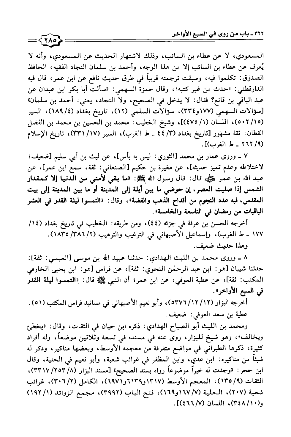 ٨ - وروى محمد بن الليث الهدادي: حدثنا عبيد الله بن موسى [العبسي: ثقة]: حدثنا شيبان [هو: ابن عبد الرحمن النحوي: ثقة]، عن فراس [هو: ابن يحيى الخارفي المكتب: ثقة]، عن عطية العوفي، عن ابن عمر؛ أن النبي - صلى الله عليه وسلم - قال: "التمسوا ليلة القدر في السبع الأواخر".