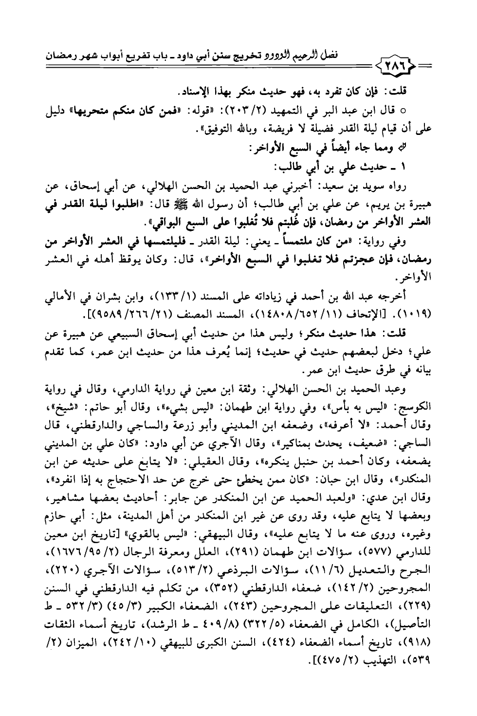 رواه سويد بن سعيد: أخبرني عبد الحميد بن الحسن الهلالي، عن أبي إسحاق، عن هبيرة بن يريم، عن علي بن أبي طالب؛ أن رسول الله - صلى الله عليه وسلم - قال: "اطلبوا ليلة القدر في العشر الأواخر من رمضان، فإن غُلبتم فلا تُغلبوا على السبع البواقي".