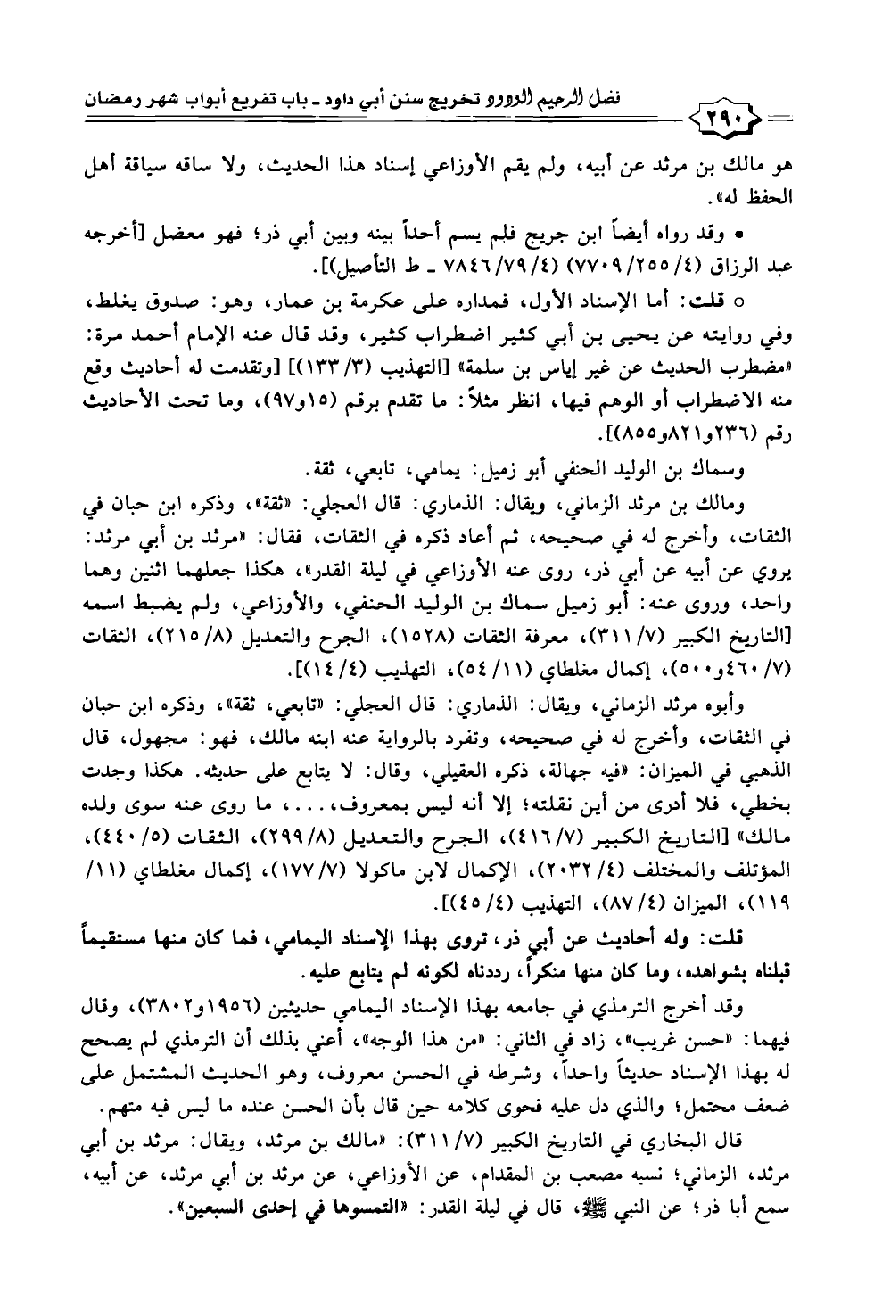 ومالك بن مرثد الزماني، ويقال: الذماري: قال العجلي: "ثقة"، وذكره ابن حبان في الثقات، وأخرج له في صحيحه، ثم أعاد ذكره في الثقات، فقال: "مرثد بن أبي مرثد: يروي عن أبيه عن أبي ذر، روى عنه الأوزاعي في ليلة القدر"، هكذا جعلهما اثنين وهما واحد، وروى عنه: أبو زميل سماك بن الوليد الحنفي، والأوزاعي، ولم يضبط اسمه [التاريخ الكبير (٧/ ٣١١)، معرفة الثقات (١٥٢٨)، الجرح والتعديل (٨/ ٢١٥)، الثقات (٧/ ٤٦٠ و ٥٠٠)، إكمال مغلطاي (١١/ ٥٤)، التهذيب (٤/ ١٤)].