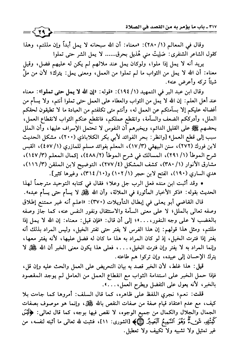 وقال ابن عبد البر في التمهيد (١/ ١٩٤): "قوله: "إن الله لا يمل حتى تملوا": معناه عند أهل العلم: إن الله لا يمل من الثواب والعطاء على العمل حتى تملوا أنتم، ولا يسأم من أفضاله عليكم إلا بسآمتكم عن العمل له، وأنتم متى تكلفتم من العبادة ما لا تطيقون لحقكم الملل، وأدرككم الضعف والسآمة، وانقطع عملكم، فانقطع عنكم الثواب لانقطاع العمل، يحضهم - صلى الله عليه وسلم - على القليل الدائم، ويخبرهم أن النفوس لا تحتمل الإسراف عليها، وأن الملل سبب إلى قطع العمل" [وانظر: بحر الفوائد لأبي بكر الكلاباذي (٢٠٠)، مشكل الحديث لابن فورك (٢٧٢)، سنن البيهقي (٣/ ١٧)، المعلم بفوائد مسلم للمازري (١/ ٤٥٧)، القبس شرح الموطأ (١/ ٢٩١)، المسالك في شرح الموطأ (٢/ ٤٨٨)، إكمال المعلم (٣/ ١٤٧)، مشارق الأنوار (١/ ٣٨٠)، كشف المشكل (٤/ ٢٧٧)، التوضيح لابن الملقن (٣/ ١١٦)، هدي الساري (١٩٠)، الفتح لابن حجر (١/ ١٠٢) و (١٠/ ٣١٤)، وغيرها كثير].