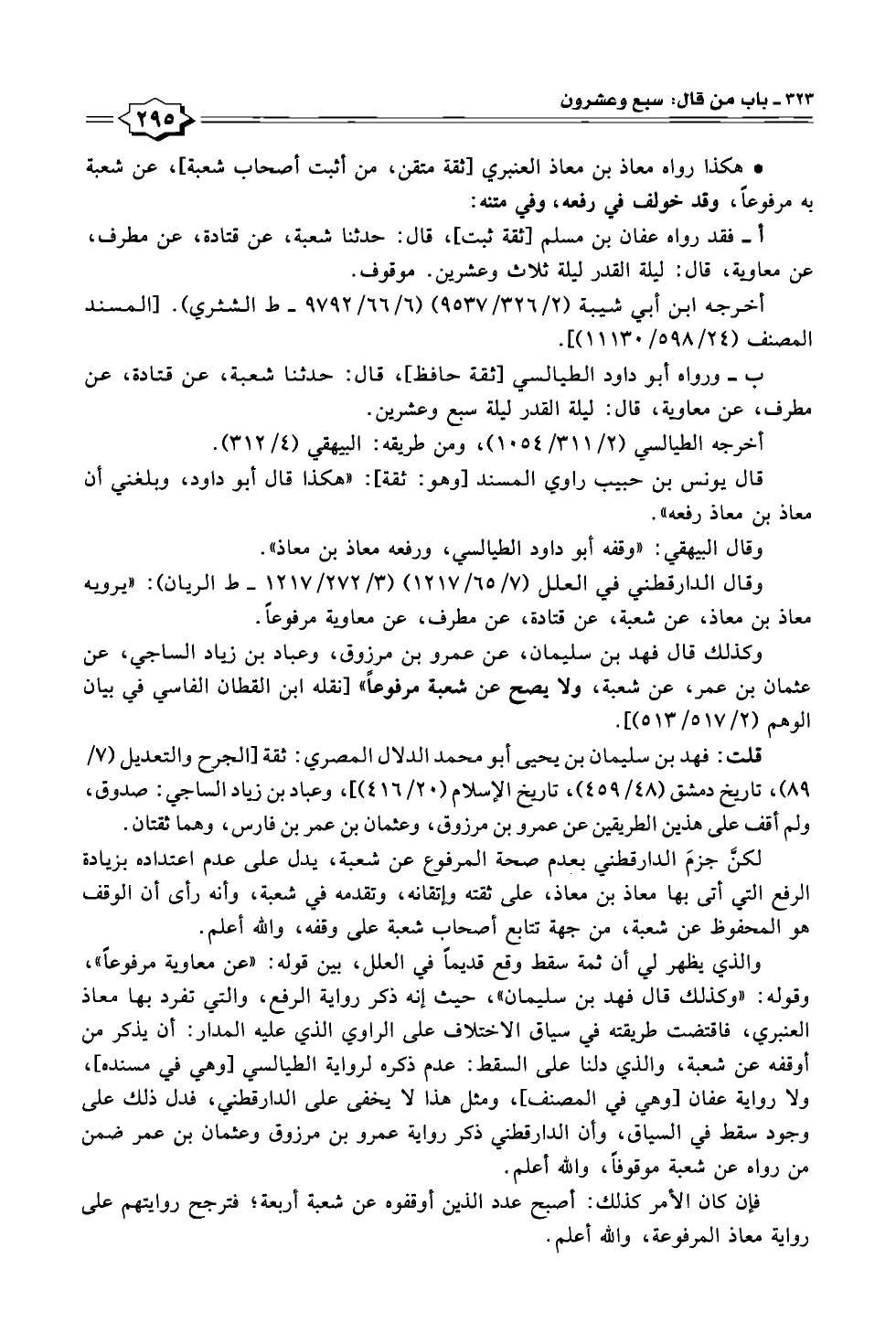 فإن كان الأمر كذلك: أصبح عدد الذين أوقفوه عن شعبة أربعة؛ فترجح روايتهم على رواية معاذ المرفوعة، والله أعلم.