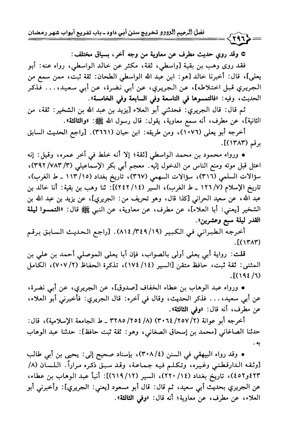 • ورواه محمود بن محمد الواسطي [ثقة؛ إلا أنه خلط في آخر عمره، وقيل: إنه اعتل قبل موته ومنع الناس من الدخول إليه. معجم أبي بكر الإسماعيلي (٣/ ٧٨٣/ ٣٩٢)، سؤالات السلمي (٣١٦)، سؤالات السهمي (٣٦٧)، تاريخ بغداد (١٥/ ١١٣ - ط الغرب)، تاريخ الإسلام (٧/ ١٢٦ - ط الغرب]، السير (١٤/ ٢٤٢)]: ثنا وهب بن بقية: أنا خالد بن عبد الله، عن سعيد الحراني [كذا قال، وهو تحريف من: الجريري]، عن يزيد بن عبد الله بن الشخير [يعني: أبا العلاء]، عن مطرف، عن معاوية، عن النبى - صلى الله عليه وسلم - قال: "التمسوا ليلة القدر ليلة سبع وعشرين".