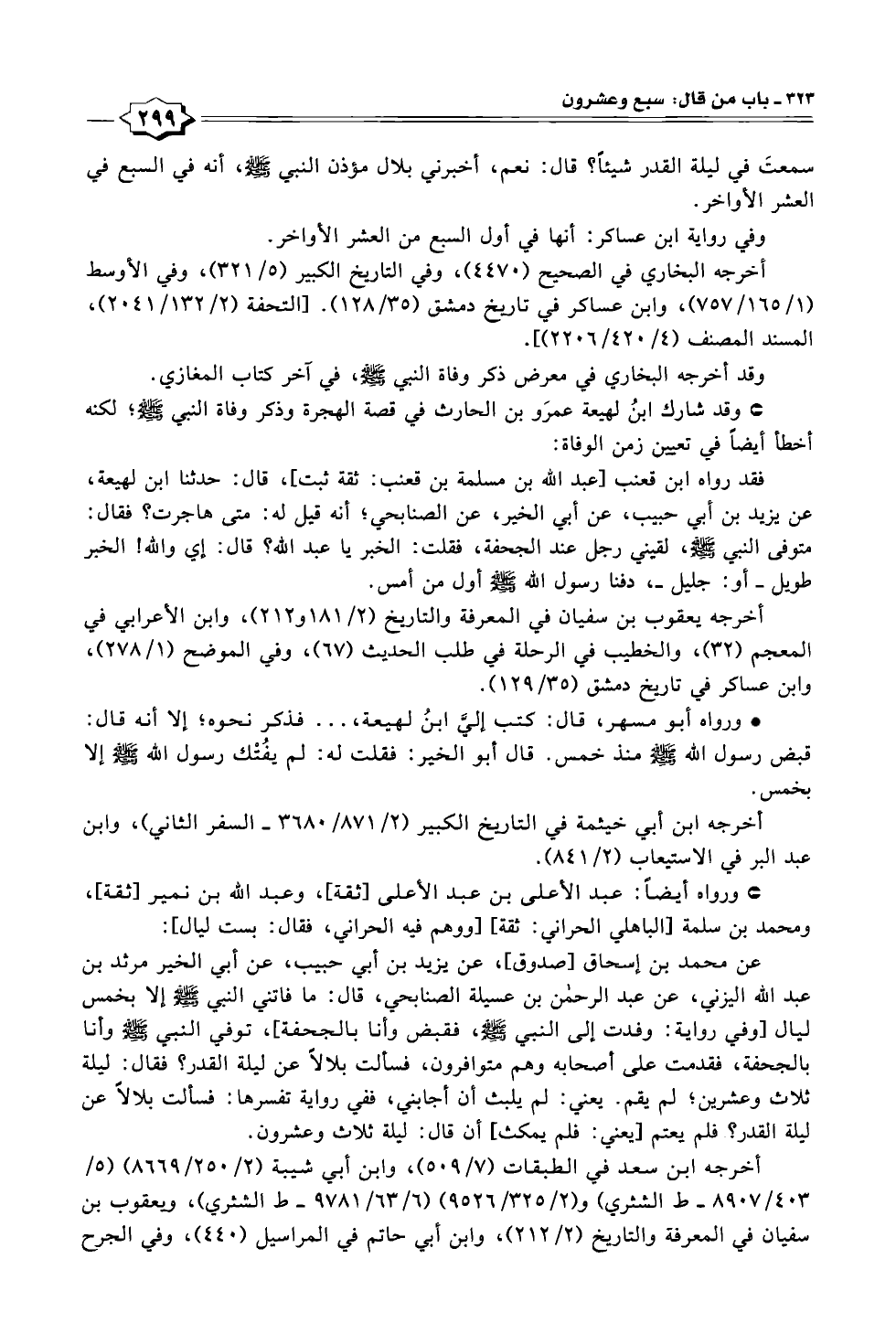 عن محمد بن إسحاق [صدوق]، عن يزيد بن أبي حبيب، عن أبي الخير مرثد بن عبد الله اليزني، عن عبد الرحمن بن عسيلة الصنابحي، قال: ما فاتني النبي - صلى الله عليه وسلم - إلا بخمس ليال [وفي رواية: وفدت إلى النبي - صلى الله عليه وسلم -، فقبض وأنا بالجحفة]، توفي النبي - صلى الله عليه وسلم - وأنا بالجحفة، فقدمت على أصحابه وهم متوافرون، فسألت بلالاً عن ليلة القدر؟ فقال: ليلة ثلاث وعشرين؛ لم يقم. يعني: لم يلبث أن أجابني، ففي رواية تفسرها: فسألت بلالًا عن ليلة القدر؟ فلم يعتم [يعني: فلم يمكث] أن قال: ليلة ثلاث وعشرون.