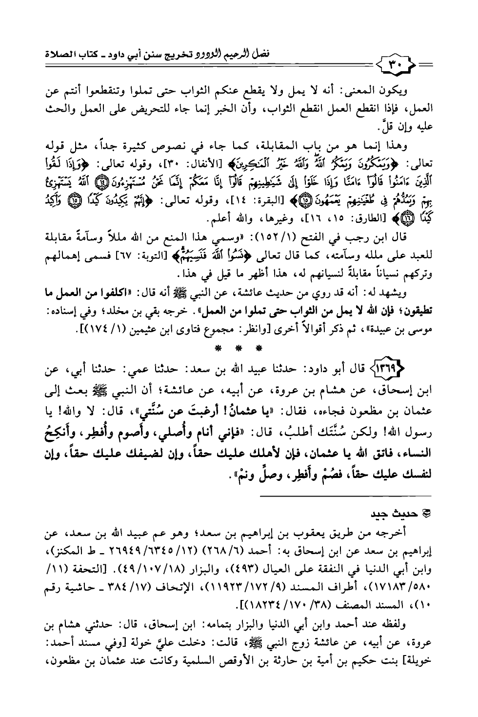 ١٣٦٩ - قال أبو داود: حدثنا عبيد الله بن سعد: حدثنا عمي: حدثنا أبي، عن ابن إسحاق، عن هشام بن عروة، عن أبيه، عن عائشة؛ أن النبي - صلى الله عليه وسلم - بعث إلى عثمان بن مظعون فجاءه، فقال: "يا عثمانُ! أرغبتَ عن سُنَّتي"، قال: لا والله! يا رسول الله! ولكن سُنَّتَك أطلبُ، قال: "فإني أنام وأُصلي، وأَصوم وأُفطِر، وأَنكِحُ النساء، فاتق الله يا عثمان، فإن لأهلك عليك حقاً، وإن لضيفك عليك حقاً، وإن لنفسك عليك حقاً، فصُمْ وأَفطِر، وصلِّ ونمْ".