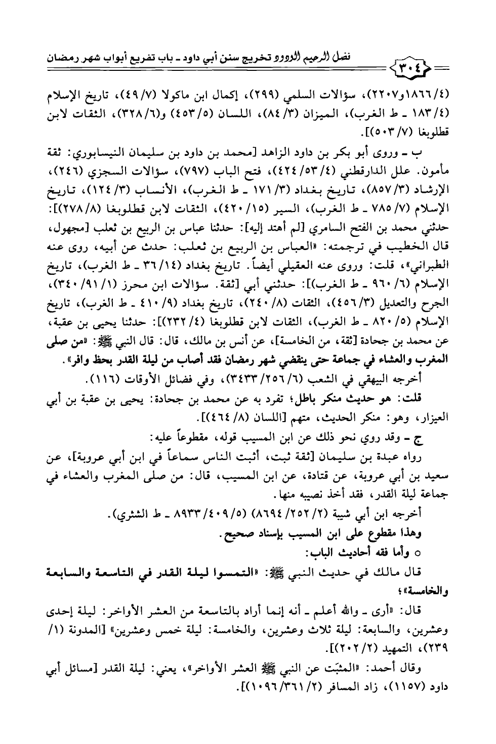 ب - وروى أبو بكر بن داود الزاهد [محمد بن داود بن سليمان النيسابوري: ثقة مأمون. علل الدارقطني (٤/ ٥٣/ ٤٢٤)، فتح الباب (٧٩٧)، سؤالات السجزي (٢٤٦)، الإرشاد (٣/ ٨٥٧)، تاريخ بغداد (٣/ ١٧١ - ط الغرب)، الأنساب (٣/ ١٢٤)، تاريخ الإسلام (٧/ ٧٨٥ - ط الغرب)، السير (١٥/ ٤٢٠)، الثقات لابن قطلوبغا (٨/ ٢٧٨)]: حدثني محمد بن الفتح السامري [لم أهتد إليه]: حدثنا عباس بن الربيع بن ثعلب [مجهول، قال الخطيب في ترجمته: "العباس بن الربيع بن ثعلب: حدث عن أبيه، روى عنه الطبراني"، قلت: وروى عنه العقيلي أيضًا. تاريخ بغداد (١٤/ ٣٦ - ط الغرب)، تاريخ الإسلام (٦/ ٩٦٠ - ط الغرب)]: حدثني أبي [ثقة. سؤالات ابن محرز (١/ ٩١/ ٣٤٠)، الجرح والتعديل (٣/ ٤٥٦)، الثقات (٨/ ٢٤٠)، تاريخ بغداد (٩/ ٤١٠ - ط الغرب)، تاريخ الإسلام (٥/ ٨٢٠ - ط الغرب)، الثقات لابن قطلوبغا (٤/ ٢٣٢)]: حدثنا يحيى بن عقبة، عن محمد بن جحادة [ثقة، من الخامسة]، عن أنس بن مالك، قال: قال النبي - صلى الله عليه وسلم -: "من صلى المغرب والعشاء في جماعة حتى ينقضي شهر رمضان فقد أصاب من ليلة القدر بحظ وافر".