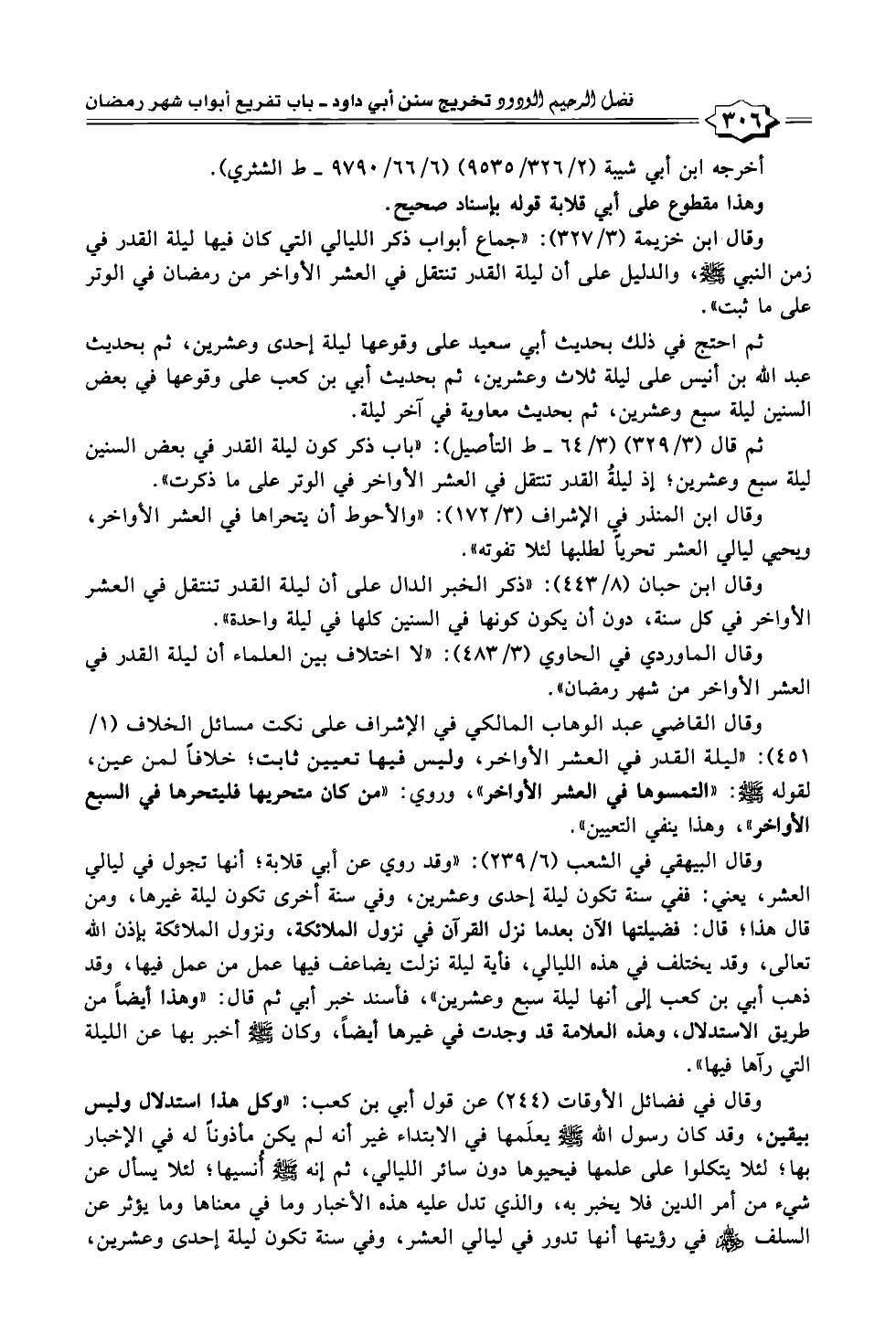 وقال- ابن خزيمة (٣/ ٣٢٧): "جماع أبواب ذكر الليالي التي كان فيها ليلة القدر في زمن النبي - صلى الله عليه وسلم -، والدليل على أن ليلة القدر تنتقل في العشر الأواخر من رمضان في الوتر على ما ثبت".