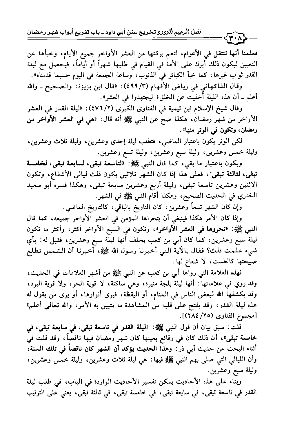 قلت: سبق بيان أن قول النبي - صلى الله عليه وسلم -: "ليلة القدر في تاسعة تبقى، في سابعة تبقى، في خامسة تبقى"، أن ذلك كان في وقائع بعينها كان شهر رمضان فيها ناقصاً، وقد قلت في أثناء البحث عن حديث أبي ذر: وهذا الحديث يؤكد أن الشهر كان ناقصاً في تلك السنة، وأن الليالي التي صلى بهم النبي - صلى الله عليه وسلم - فيها: هي ليلة ثلاث وعشرين، وليلة خمس وعشرين، وليلة سبع وعشرين.