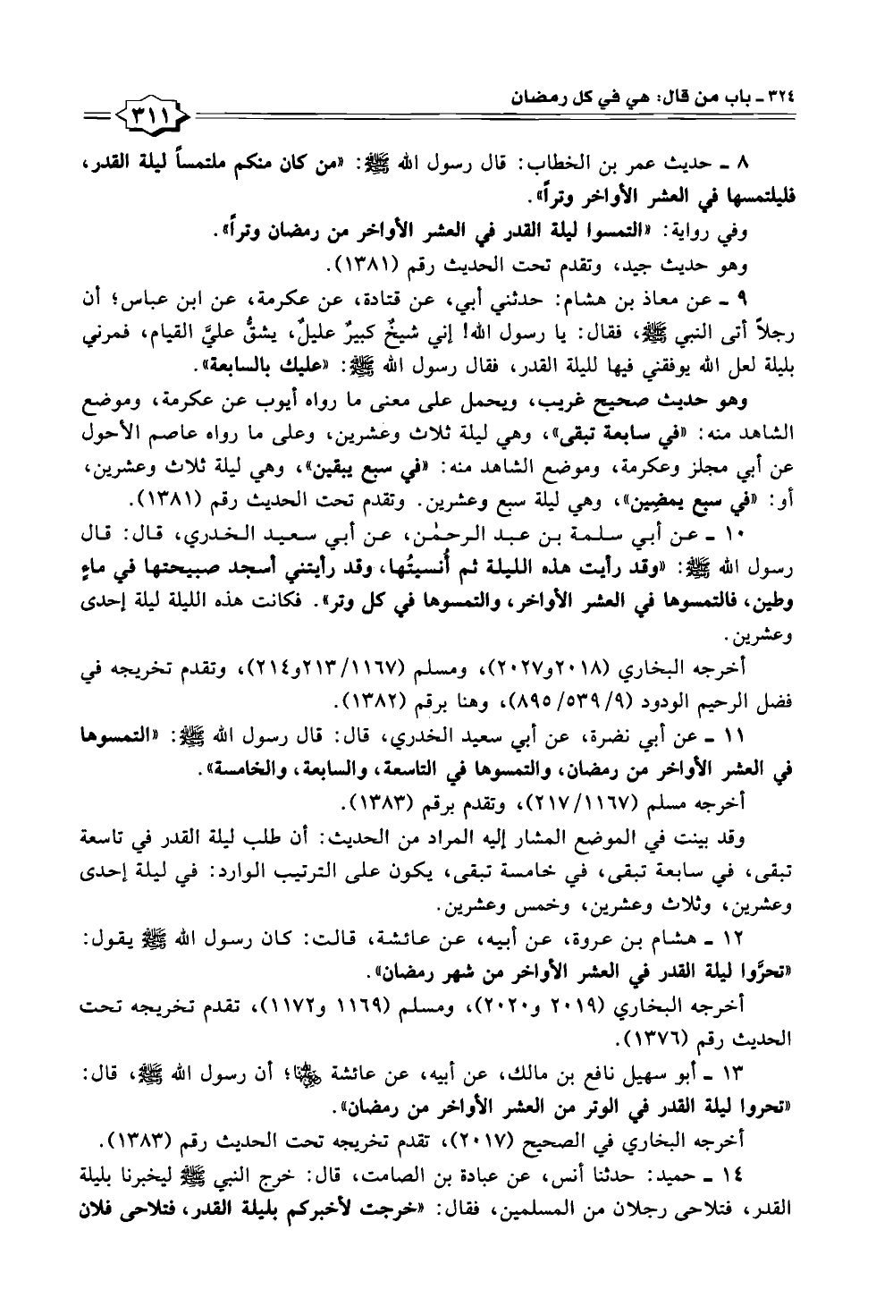 وقد بينت في الموضع المشار إليه المراد من الحديث: أن طلب ليلة القدر في تاسعة تبقى، في سابعة تبقى، في خامسة تبقى، يكون على الترتيب الوارد: فى ليلة إحدى وعشرين، وثلاث وعشرين، وخمس وعشرين.