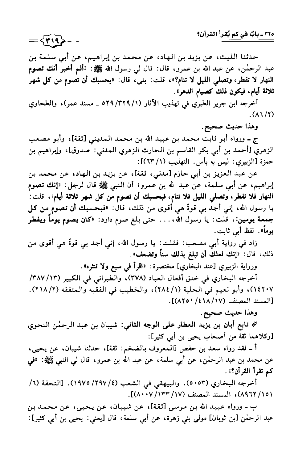 أ - فقد رواه سعد بن حفص [المعروف بالضخم: ثقة]، حدثنا شيبان، عن يحيى، عن محمد بن عبد الرحمن، عن أبي سلمة، عن عبد الله بن عمرو، قال لي النبي - صلى الله عليه وسلم -: "في كم تقرأ القرآن؟ ".