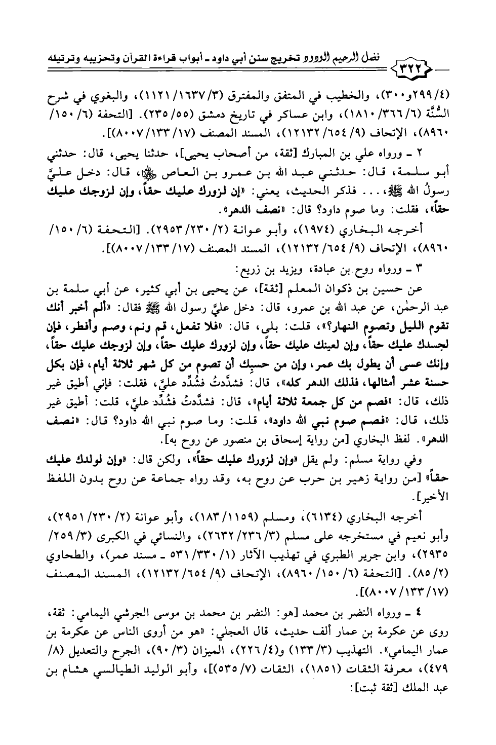 عن حسين بن ذكوان المعلم [ثقة]، عن يحيى بن أبي كثير، عن أبي سلمة بن عبد الرحمن، عن عبد الله بن عمرو، قال: دخل علىَّ رسول الله - صلى الله عليه وسلم - فقال: "ألم أخبر أنك تقوم الليل وتصوم النهار؟ "، قلت: بلى، قال: "فلا تفعل، قم ونم، وصم وأفطر، فإن لجسدك عليك حقاً، وإن لعينك عليك حقًا، وإن لزورك عليك حقاً، وإن لزوجك عليك حقاً، وإنك عسى أن يطول بك عمر، وإن من حسبِك أن تصوم من كل شهر ثلاثة أيام، فإن بكل حسنة عشر أمثالها، فدلك الدهر كله"، قال: فشدَّدتُ فشُدِّد عليَّ، فقلت: فإني أطيق غير ذلك، قال: "فصم من كل جمعة ثلاثة أيام"، قال: فشدَّدتُ فشُدِّد. عليَّ، قلت: أطيق غير ذلك، قال: "فصم صوم نبي الله داود"، قلت: وما صوم نبي الله داود؟ قال: "نصف الدهر". لفظ البخاري [من رواية إسحاق بن منصور عن روح به].