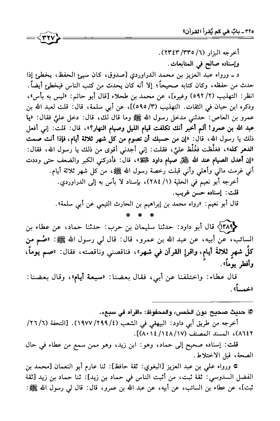 ١٣٨٩ قال أبو داود: حدثنا سليمان بن حرب: حدثنا حماد، عن عطاء بن السائب، عن أبيه، عن عبد الله بن عمرو، قال: قال لي رسول الله - صلى الله عليه وسلم -: "صُم من كلِّ شهرٍ ثلاثةَ أيامٍ، واقرإ القرآن في شهر"، فناقصني وناقصته، فقال: "صم يومًا، وأفطر يومًا".