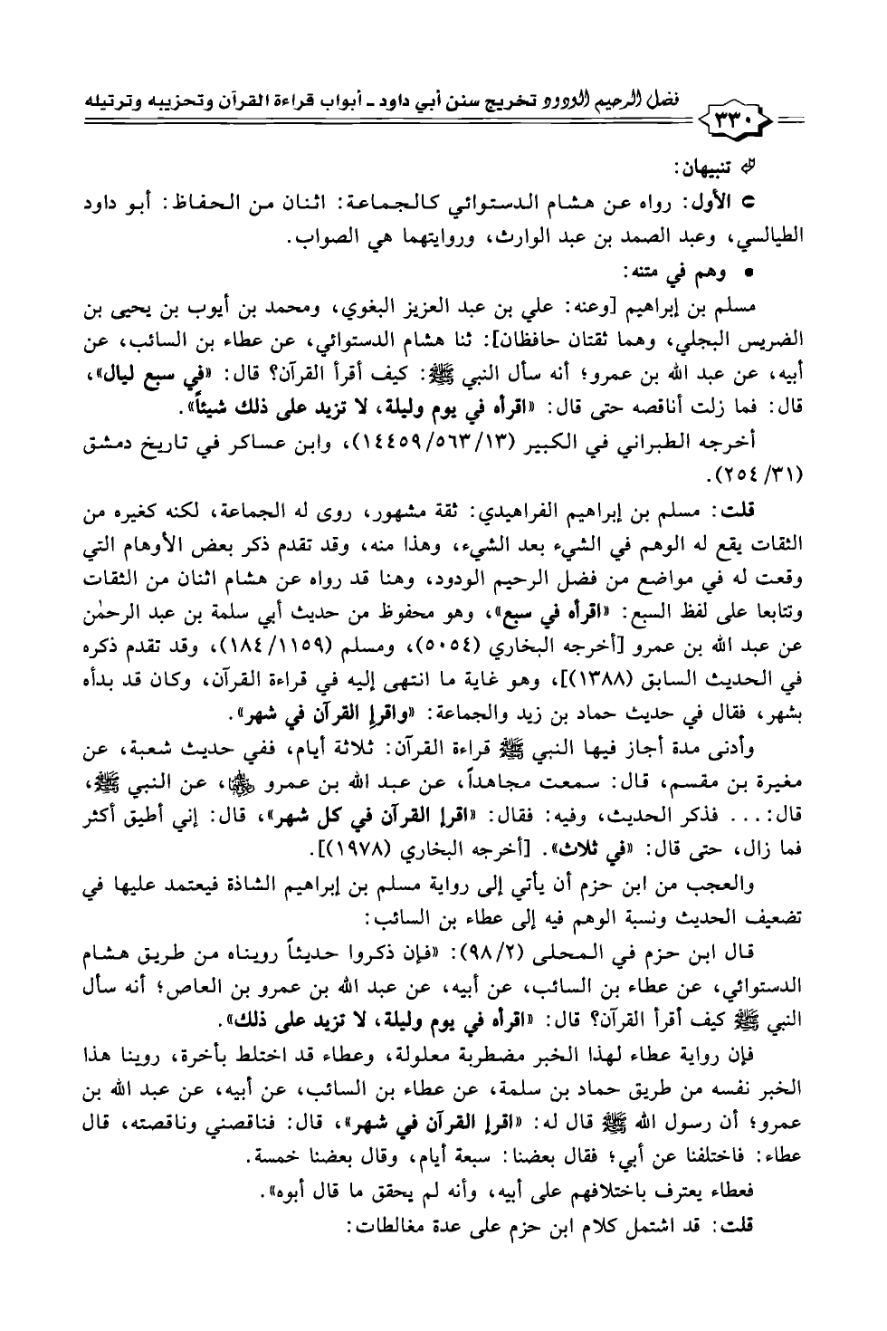 قال ابن حزم في المحلى (٢/ ٩٨): "فإن ذكروا حديثًا رويناه من طريق هشام الدستوائي، عن عطاء بن السائب، عن أبيه، عن عبد الله بن عمرو بن العاص؛ أنه سأل النبي - صلى الله عليه وسلم - كيف أقرأ القرآن؟ قال: "اقرأه في يوم وليلة، لا تزيد على ذلك".
