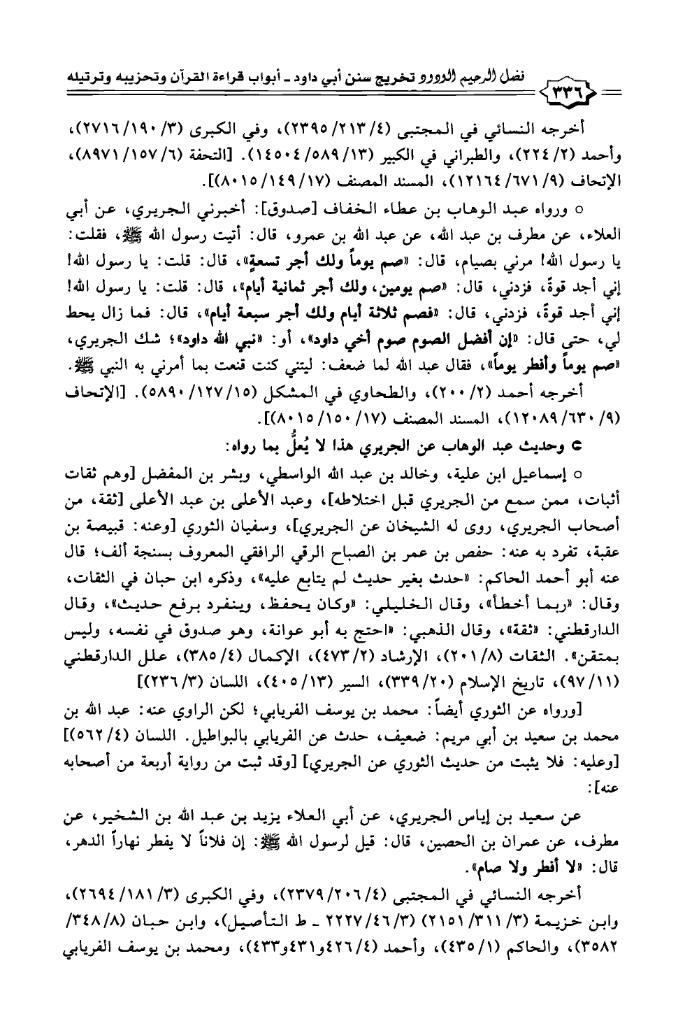 ° ورواه عبد الوهاب بن عطاء الخفاف [صدوق]: أخبرني الجريري، عن أبي العلاء، عن مطرف بن عبد الله، عن عبد الله بن عمرو، قال: أتيت رسول الله - صلى الله عليه وسلم -، فقلت: يا رسول الله! مرني بصيام، قال: "صم يومًا ولك أجر تسعةٍ"، قال: قلت: يا رسول الله! إني أجد قوةً، فزدني، قال: "صم يومين، ولك أجر ثمانية أيام"، قال: قلت: يا رسول الله! إني أجد قوةً، فزدني، قال: "فصم ثلاثة أيام ولك أجر سبعة أيام"، قال: فما زال يحط لي، حتى قال: "إن أفضل الصوم صوم أخي داود"، أو: "نبي الله داود"؛ شك الجريري، "صم يومًا وأفطر يومًا"، فقال عبد الله لما ضعف: ليتني كنت قنعت بما أمرني به النبي - صلى الله عليه وسلم -.
