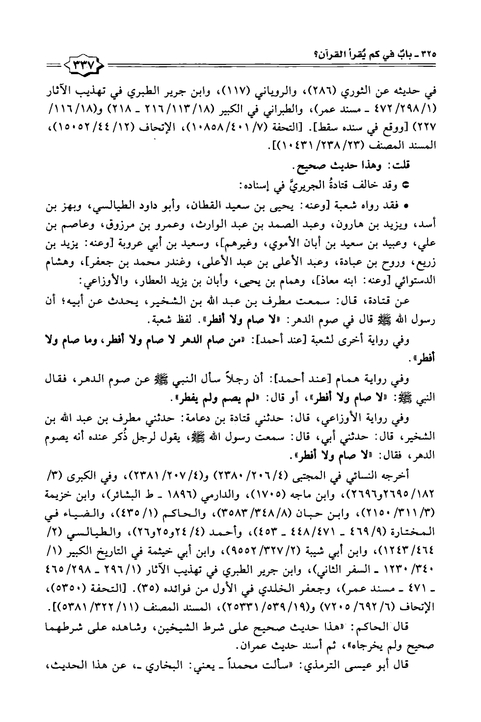 وفي رواية الأوزاعي، قال: حدثني قتادة بن دعامة: حدثني مطرف بن عبد الله بن الشخير، قال: حدثني أبي، قال: سمعت رسول الله - صلى الله عليه وسلم -، يقول لرجل ذُكر عنده أنه يصوم الدهر، فقال: "لا صام ولا أفطر".