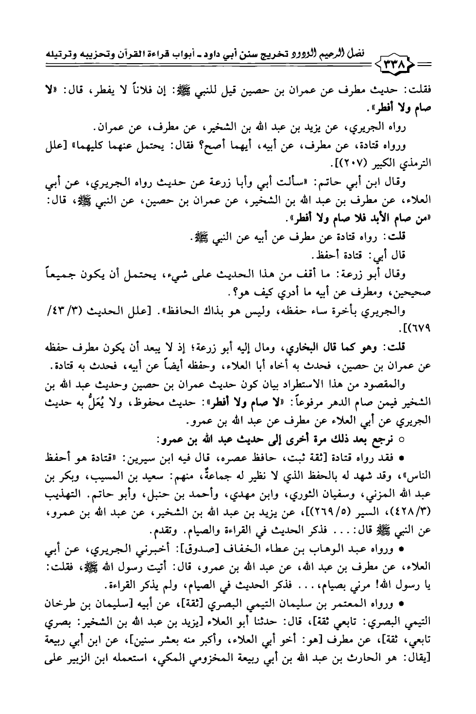 وقال ابن أبي حاتم: "سألت أبي وأبا زرعة عن حديث رواه الجريري، عن أبي العلاء، عن مطرف بن عبد الله بن الشخير، عن عمران بن حصين، عن النبي - صلى الله عليه وسلم -، قال: "من صام الأبد فلا صام ولا أفطر".