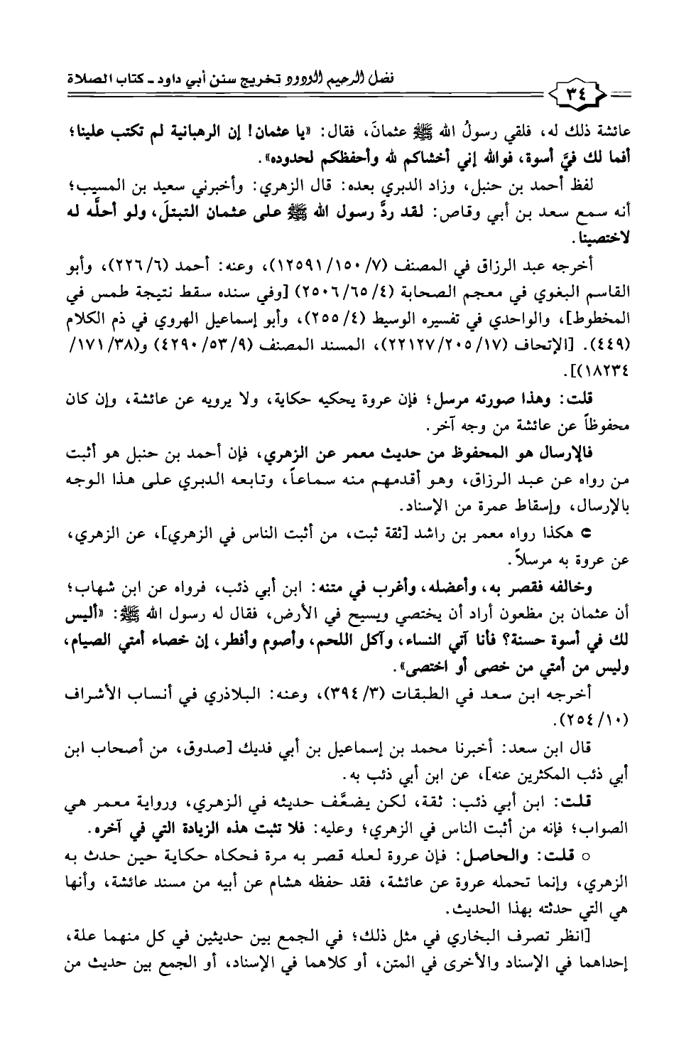 وخالفه فقصر به، وأعضله، وأغرب في متنه: ابن أبي ذئب، فرواه عن ابن شهاب؛ أن عثمان بن مظعون أراد أن يختصي ويسيح في الأرض، فقال له رسول الله - صلى الله عليه وسلم -: "أليس لك في أسوة حسنة؟ فأنا آتي النساء، وآكل اللحم، وأصوم وأفطر، إن خصاء أمتي الصيام، وليس من أمتي من خصى أو اختصى".